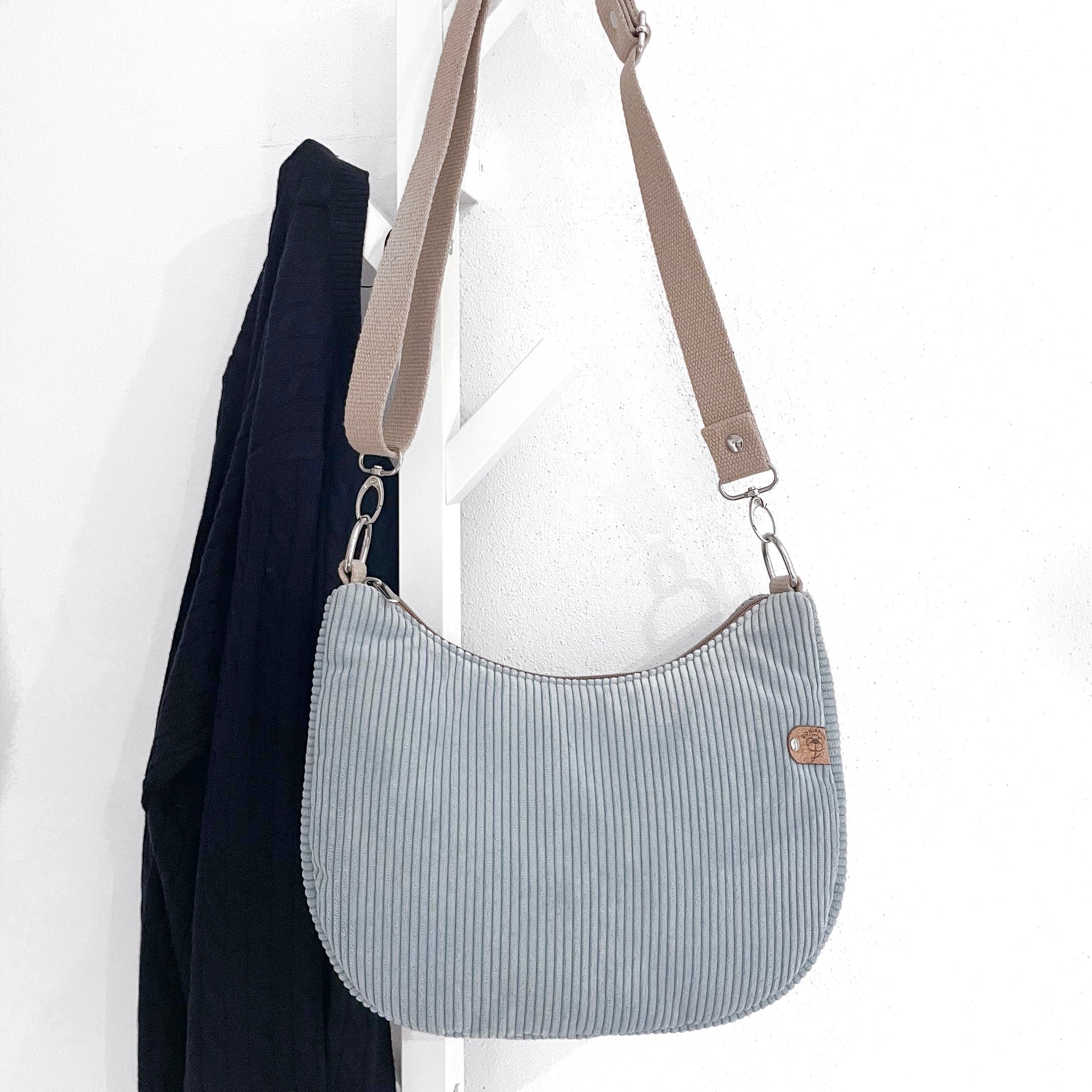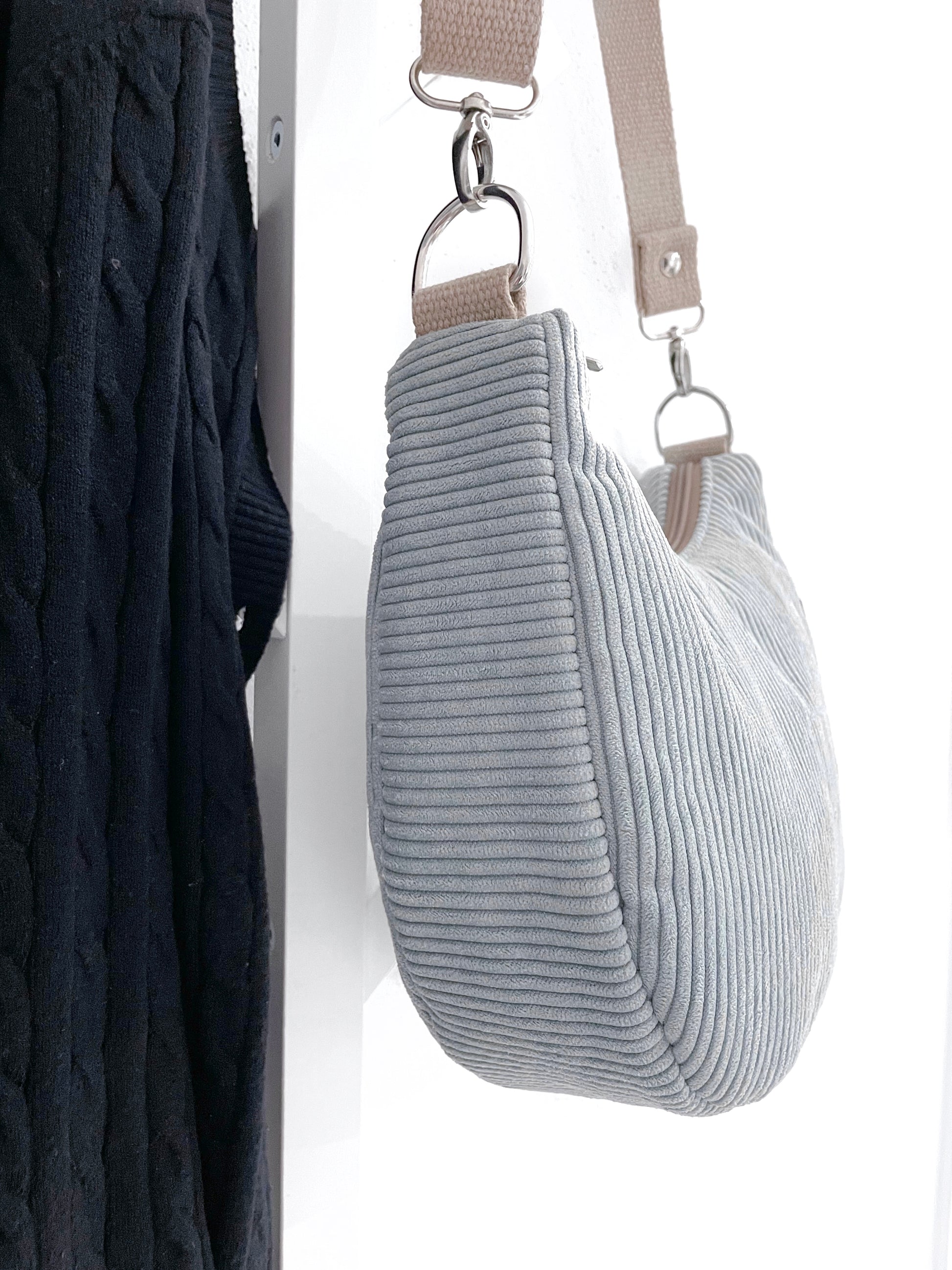 Borsa semplice in velluto con un’unico spazio interno, da portare a tracolla o a spalla. La tracolla è regolabile e si può staccare sganciando i moschettoni.