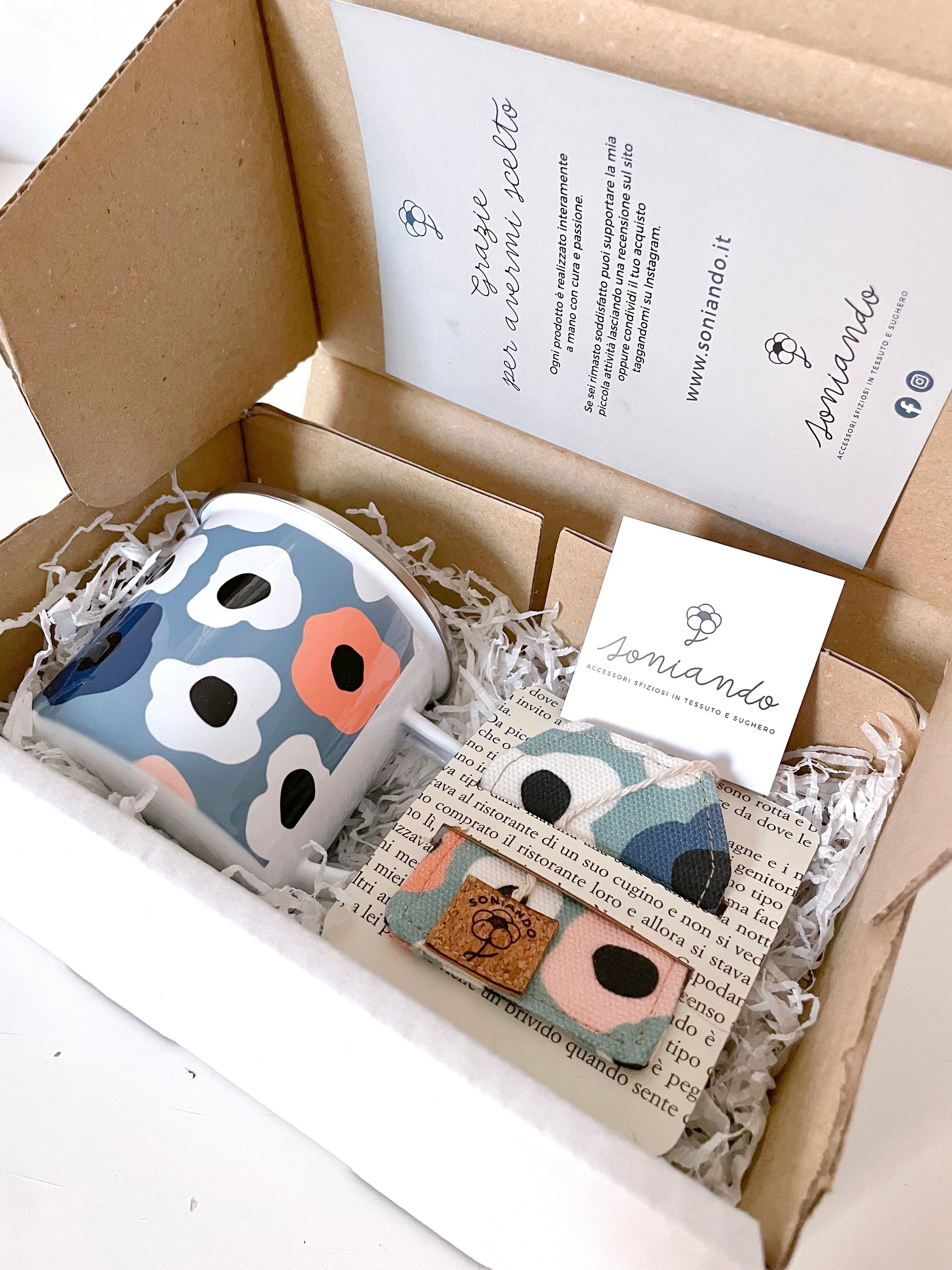 La box è composta da una tazza in metallo e da un segnalibro a forma di bustina di te in tessuto.