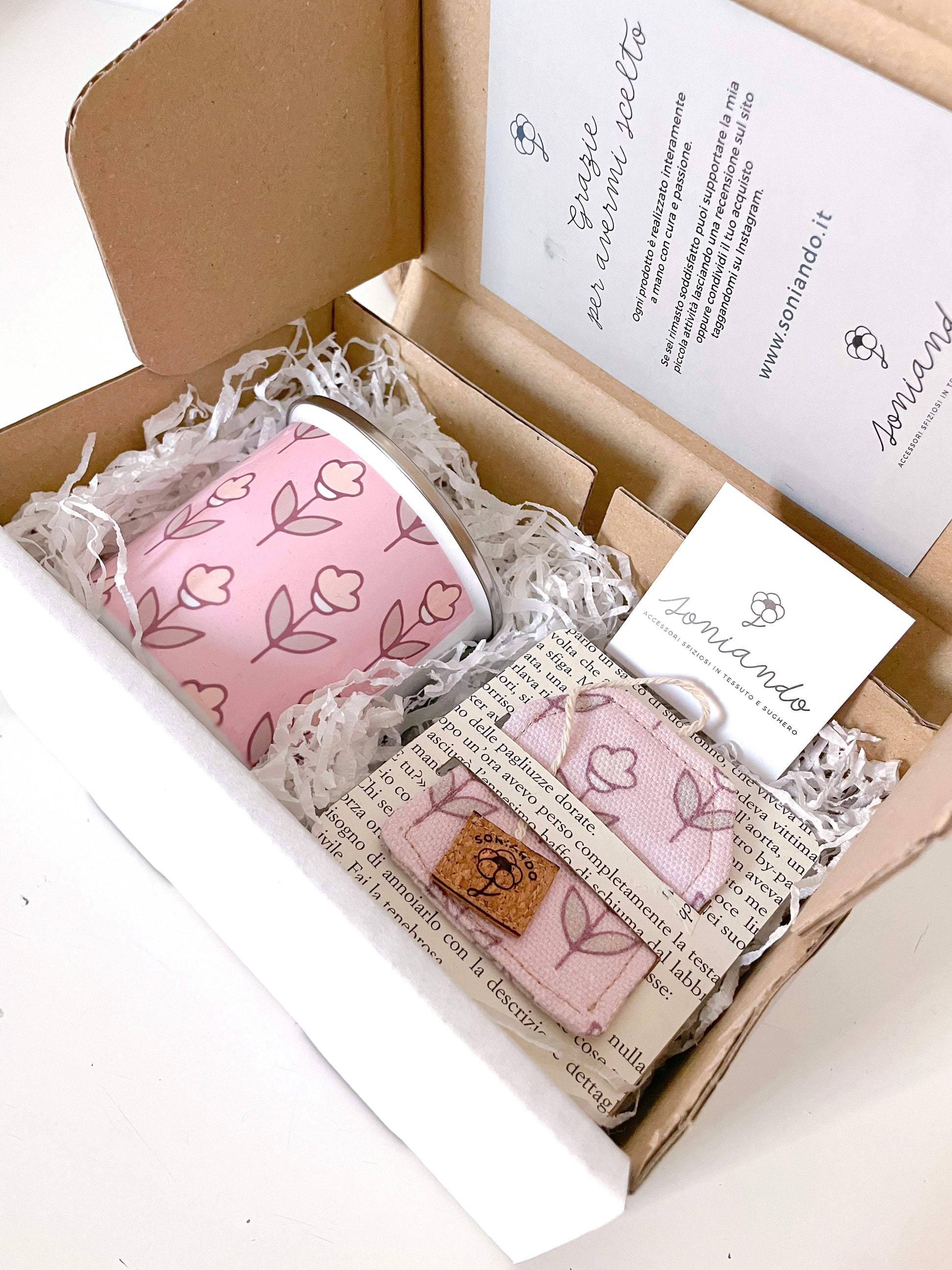 La box è composta da una tazza in metallo e da un segnalibro a forma di bustina di te in tessuto.
