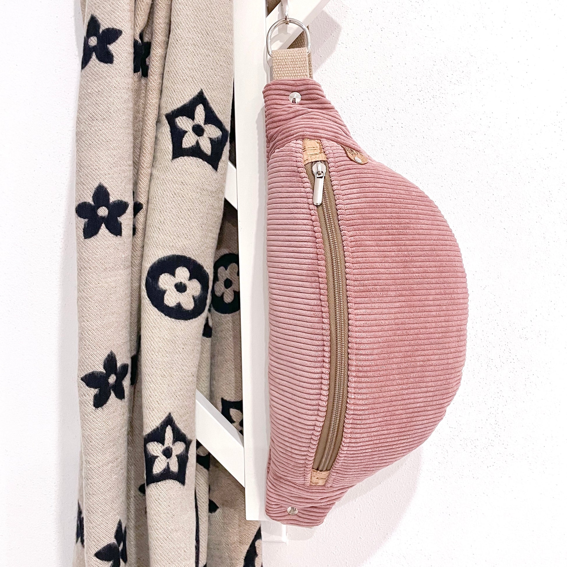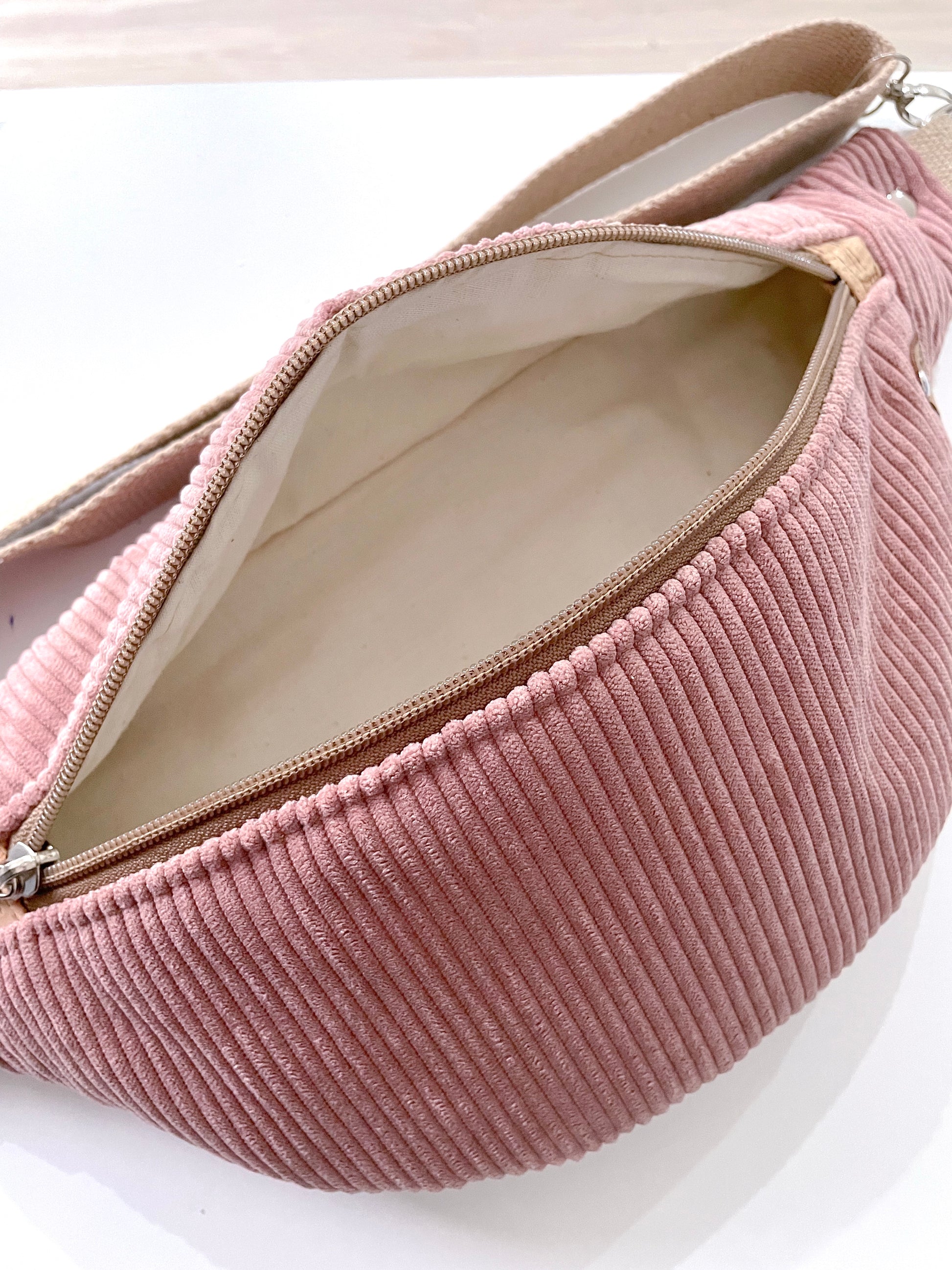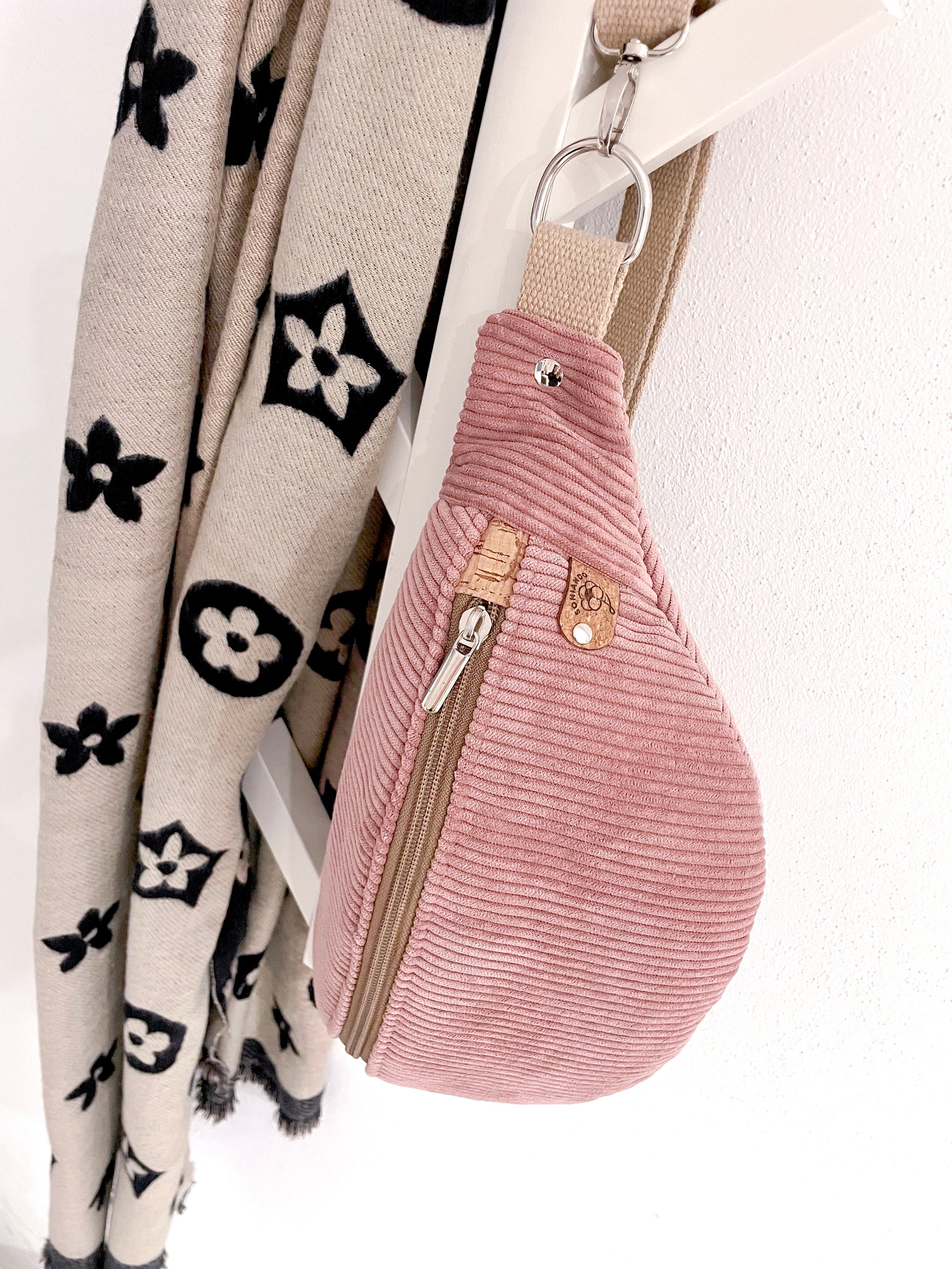 Capiente marsupio realizzato in velluto, fodera interna in cotone e piccoli dettagli in sughero.