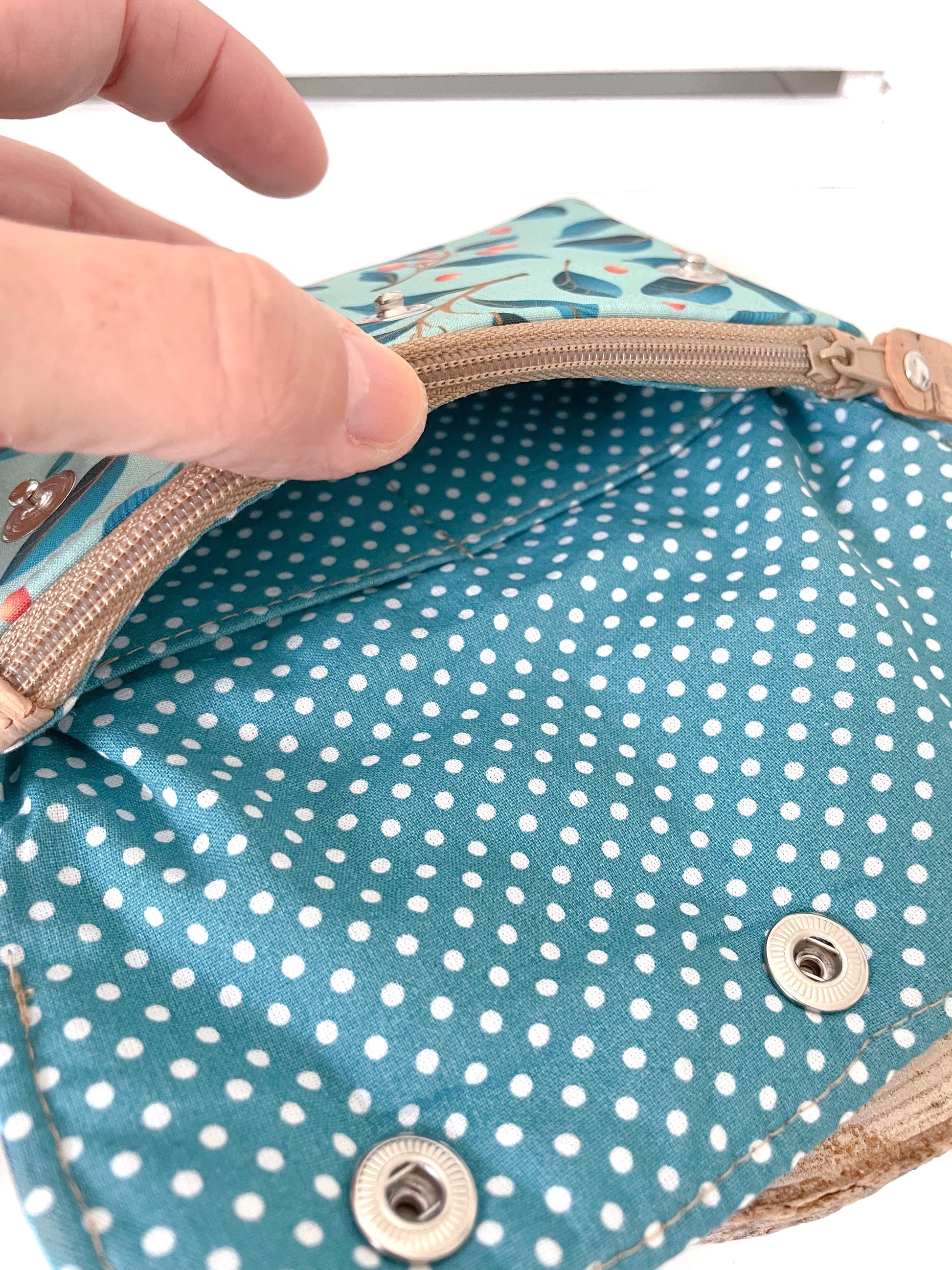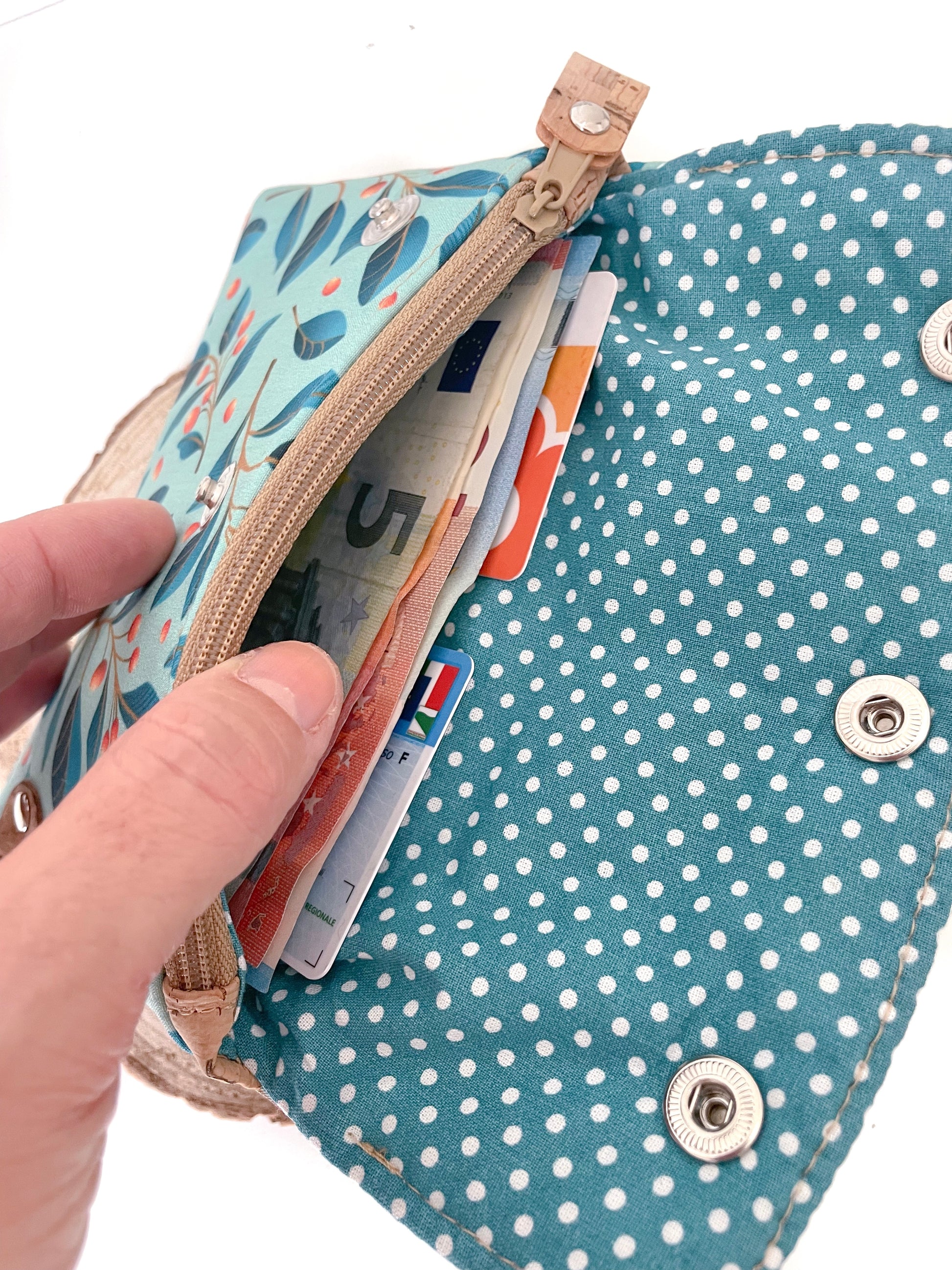 Composto da due tasche per cards (ogni tasca ne può contenere più di una), una tasca grande con zip per monete e uno spazio per tenere le banconote distese e ben visibili.