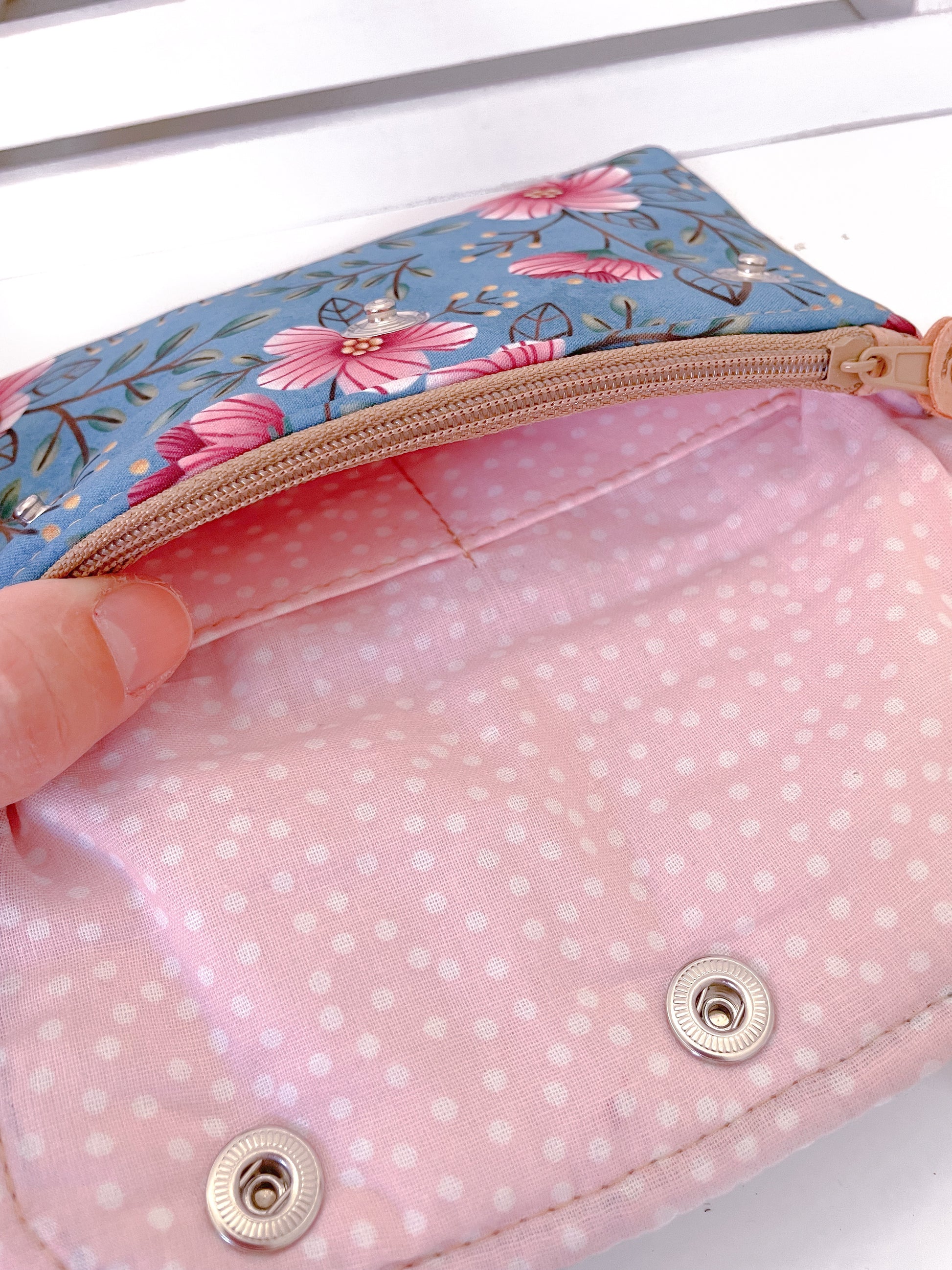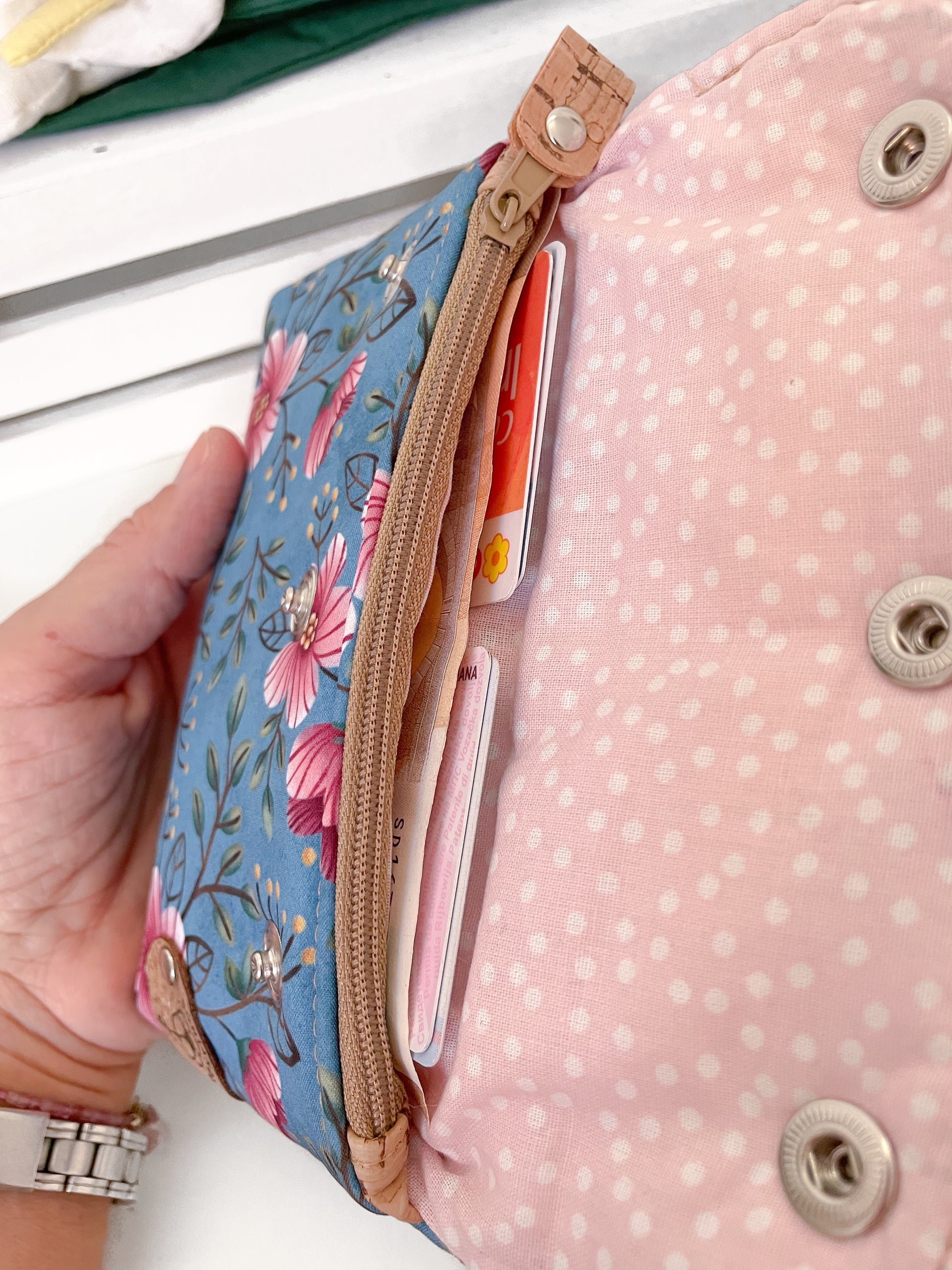 Composto da due tasche per cards (ogni tasca ne può contenere più di una), una tasca grande con zip per monete e uno spazio per tenere le banconote distese e ben visibili.