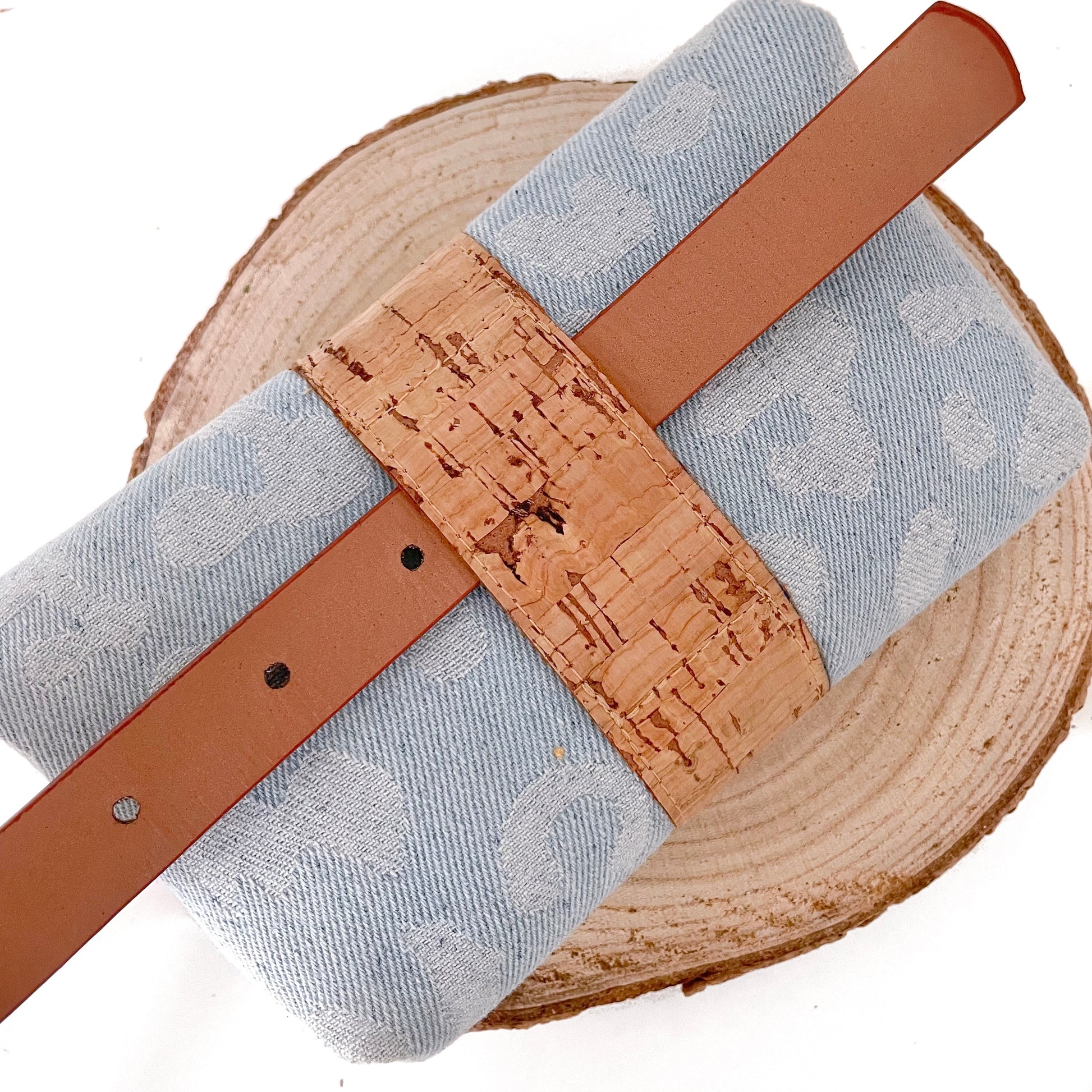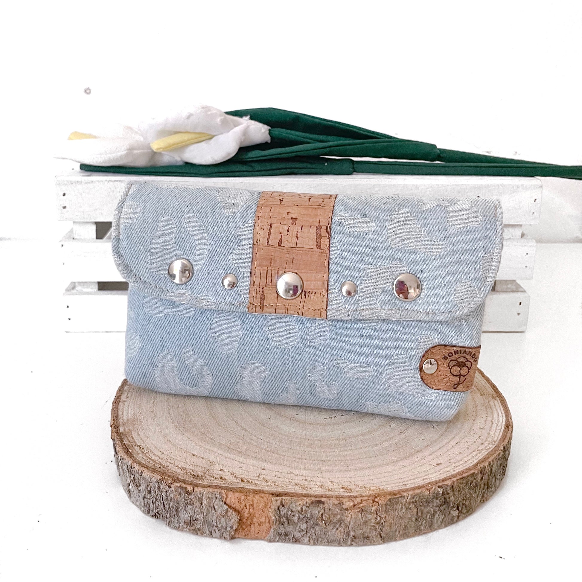 Realizzato in sughero naturale e jeans chiaro con trama animalier.