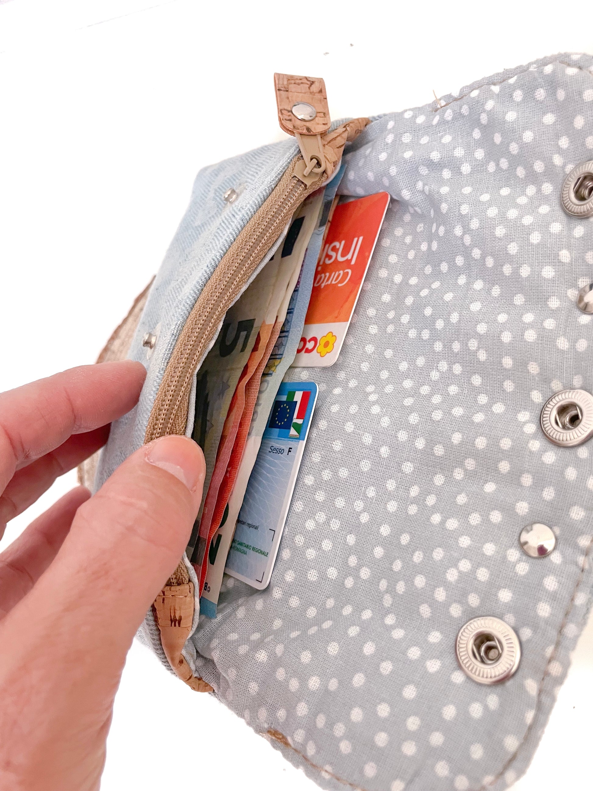 Composto da due tasche per cards (ogni tasca ne può contenere più di una), una tasca grande con zip per monete e uno spazio per tenere le banconote distese e ben visibili.