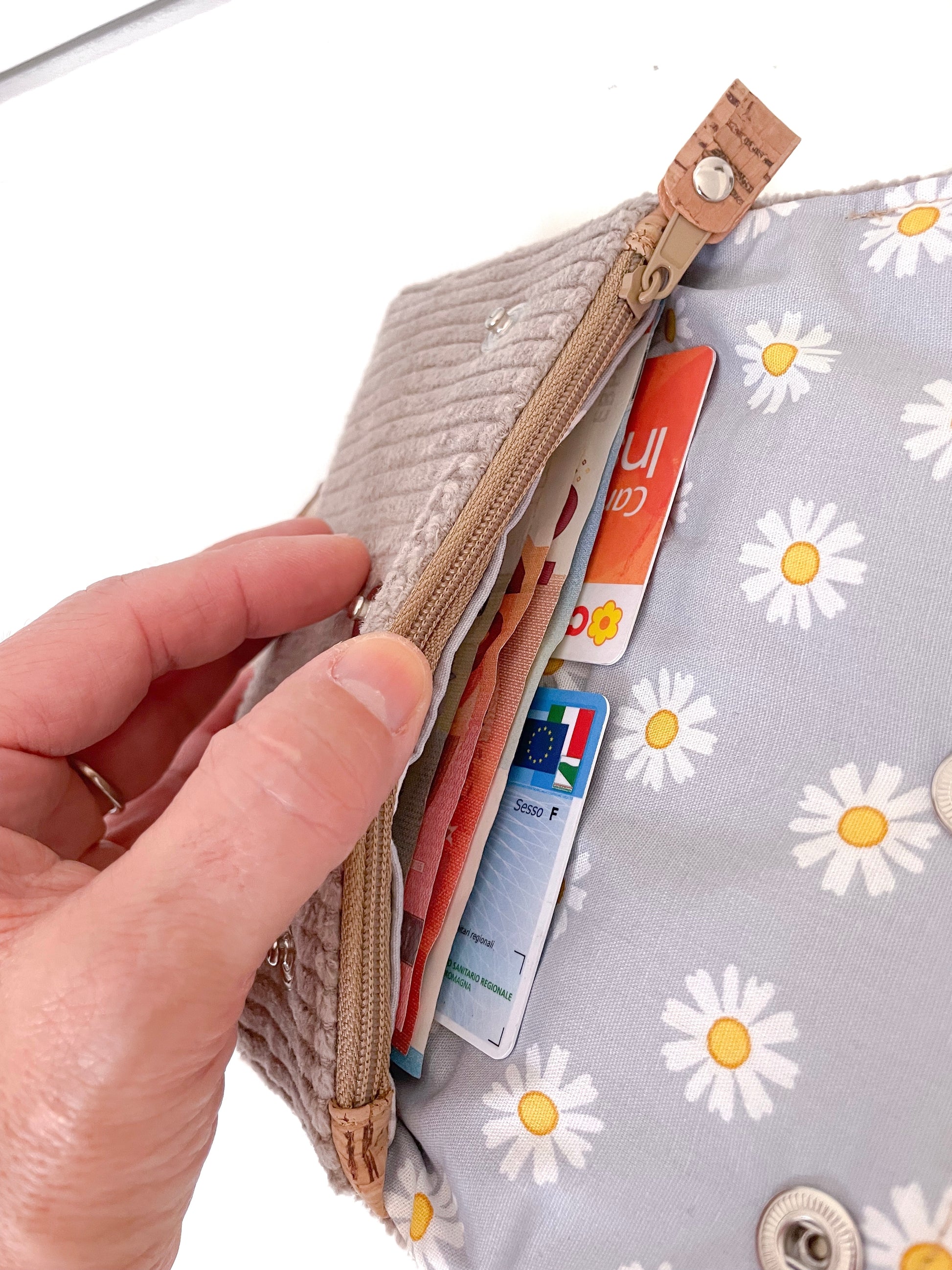 Composto da due tasche per cards (ogni tasca ne può contenere più di una), una tasca grande con zip per monete e uno spazio per tenere le banconote distese e ben visibili.