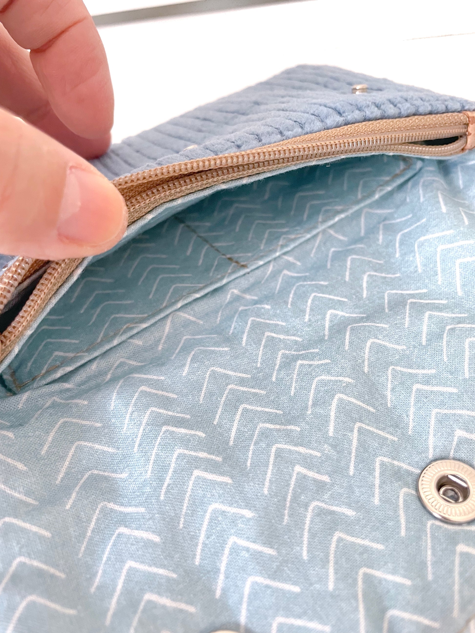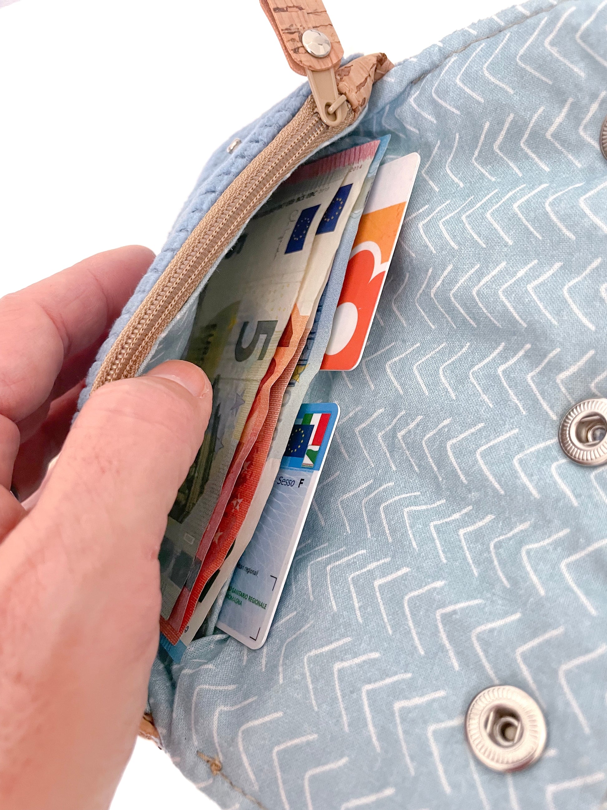 Composto da due tasche per cards (ogni tasca ne può contenere più di una), una tasca grande con zip per monete e uno spazio per tenere le banconote distese e ben visibili.
