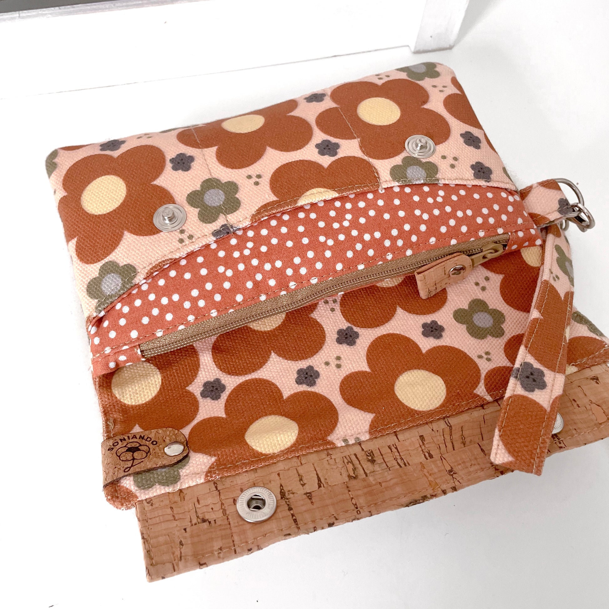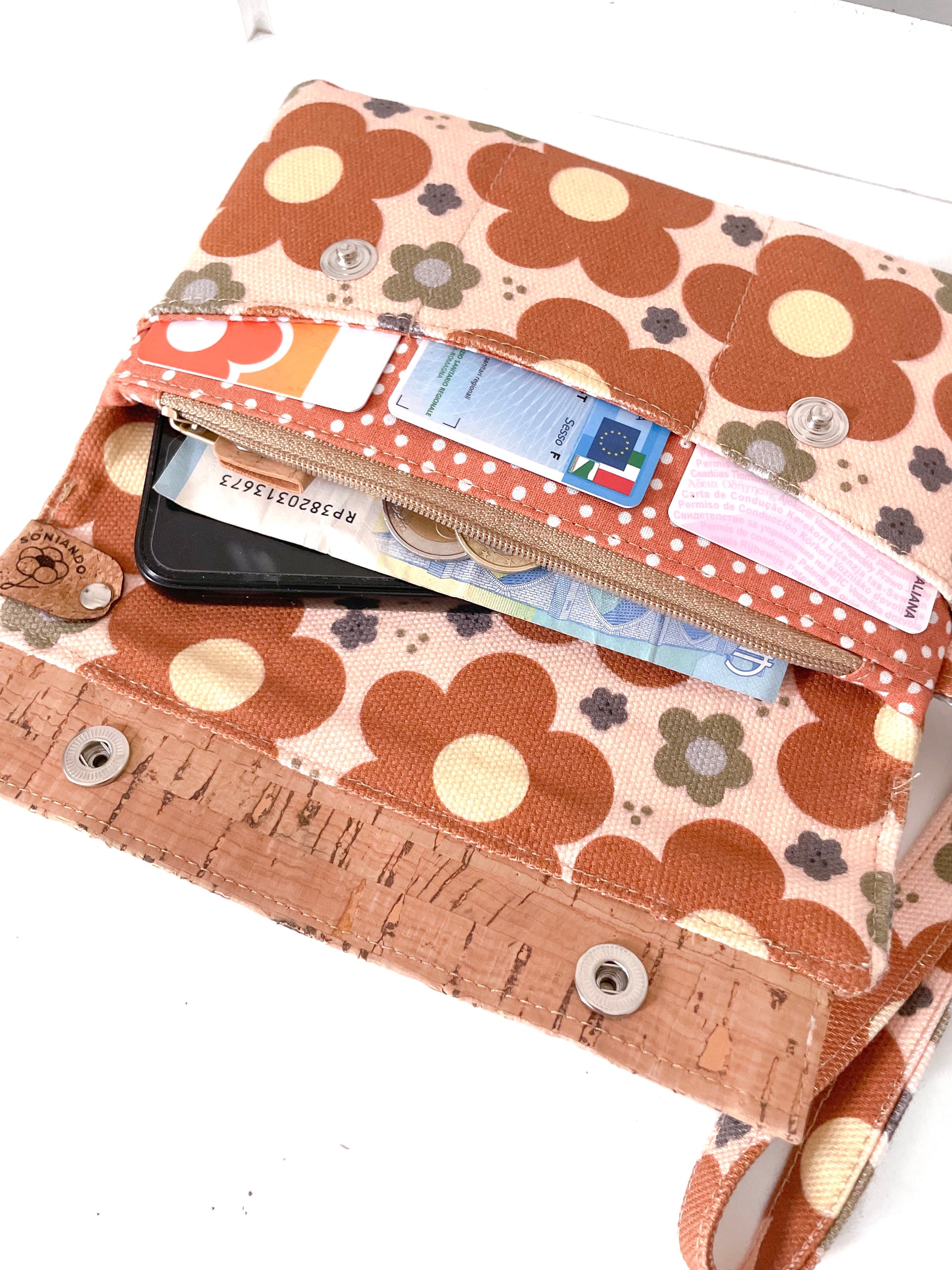 Composto da tre tasche per cards (ogni tasca ne può contenere più di una), una tasca grande con zip per banconote e monete e uno spazio per il cellulare.