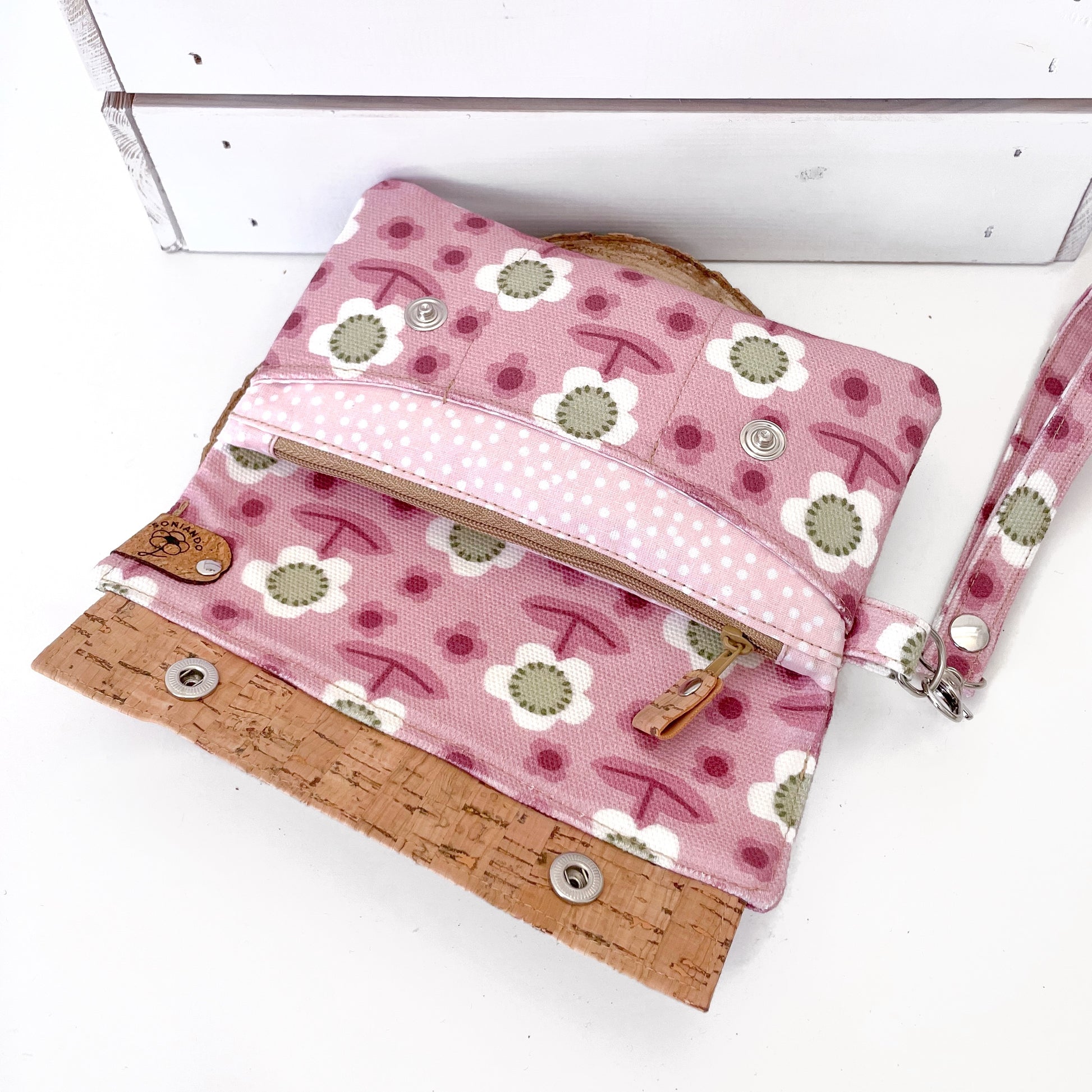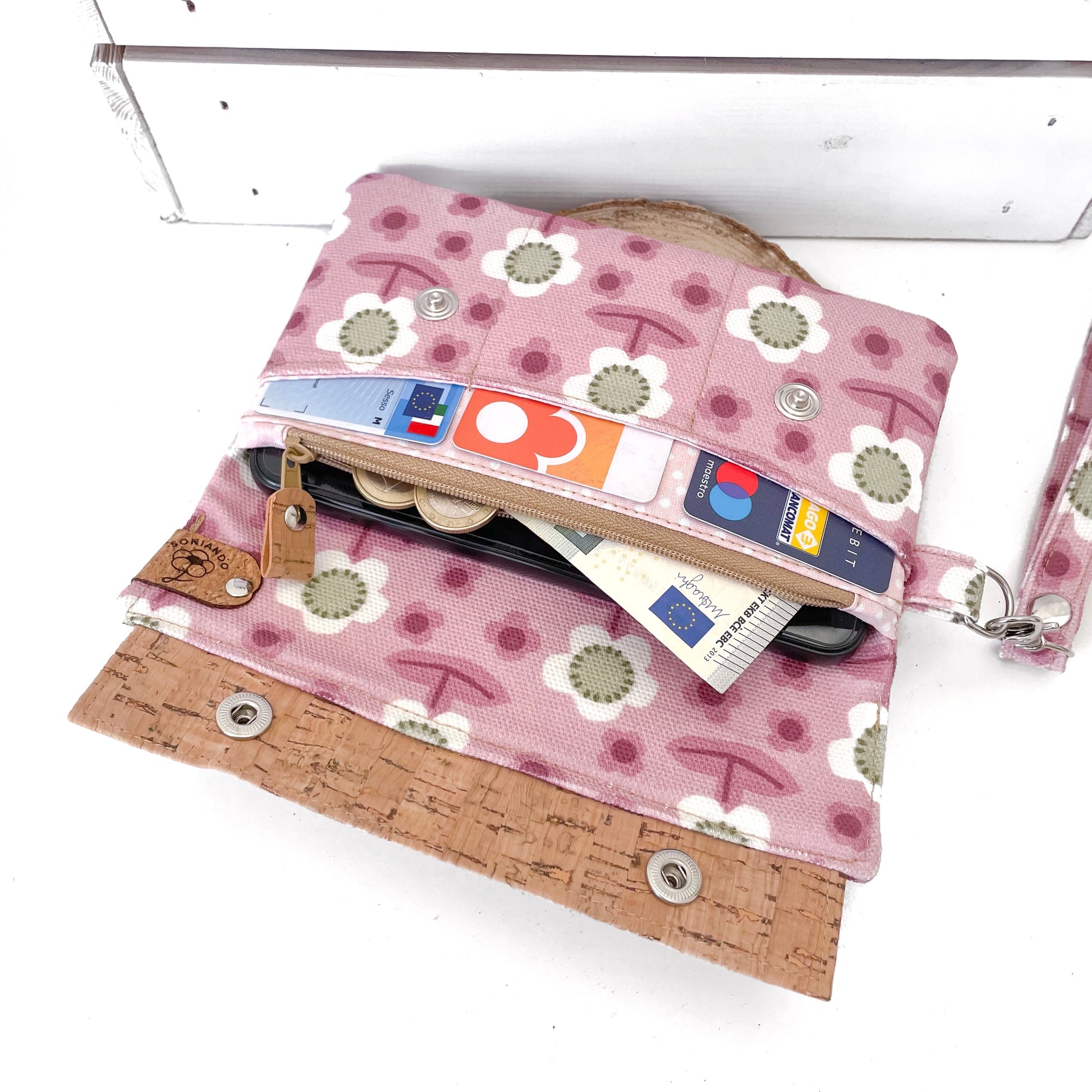 Composto da tre tasche per cards (ogni tasca ne può contenere più di una), una tasca grande con zip per banconote e monete e uno spazio per il cellulare.
