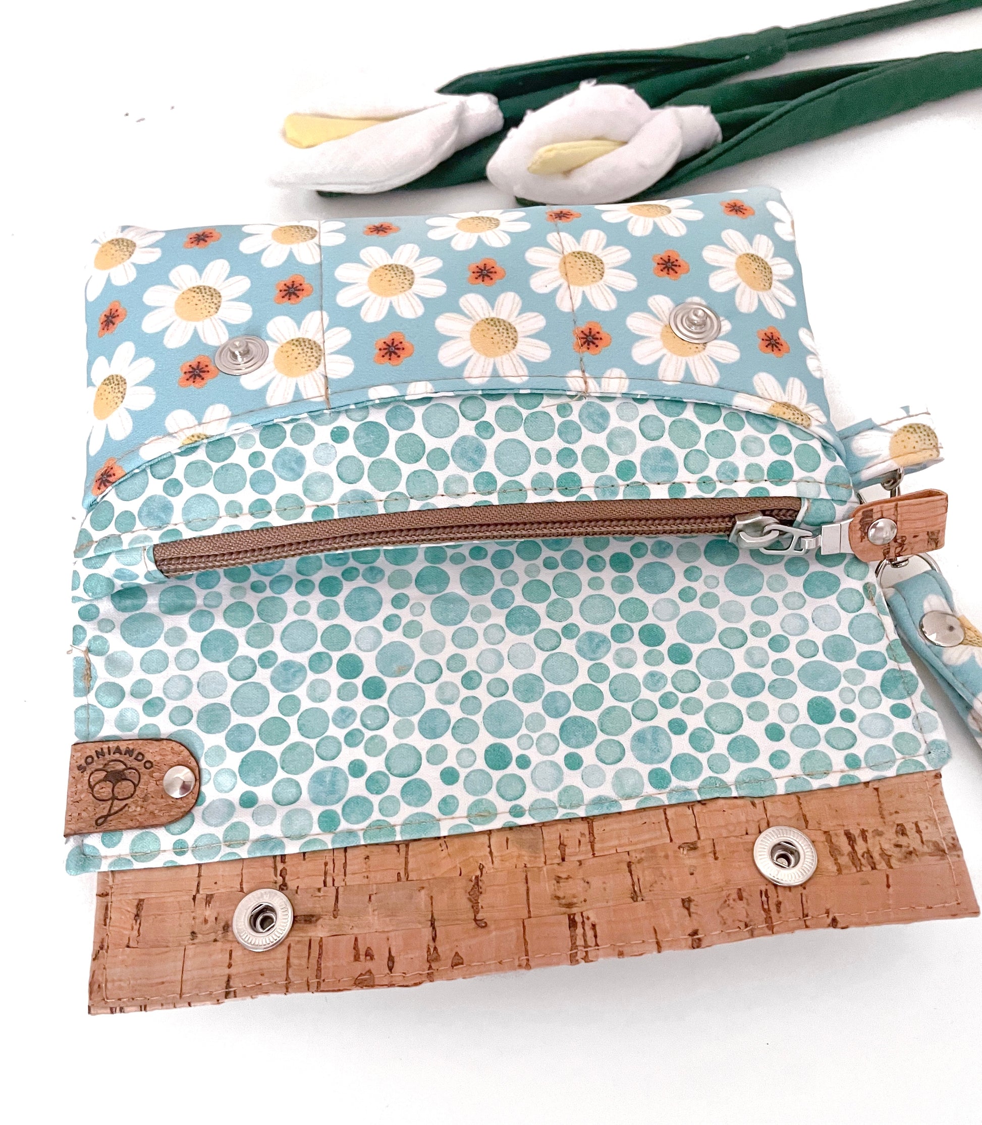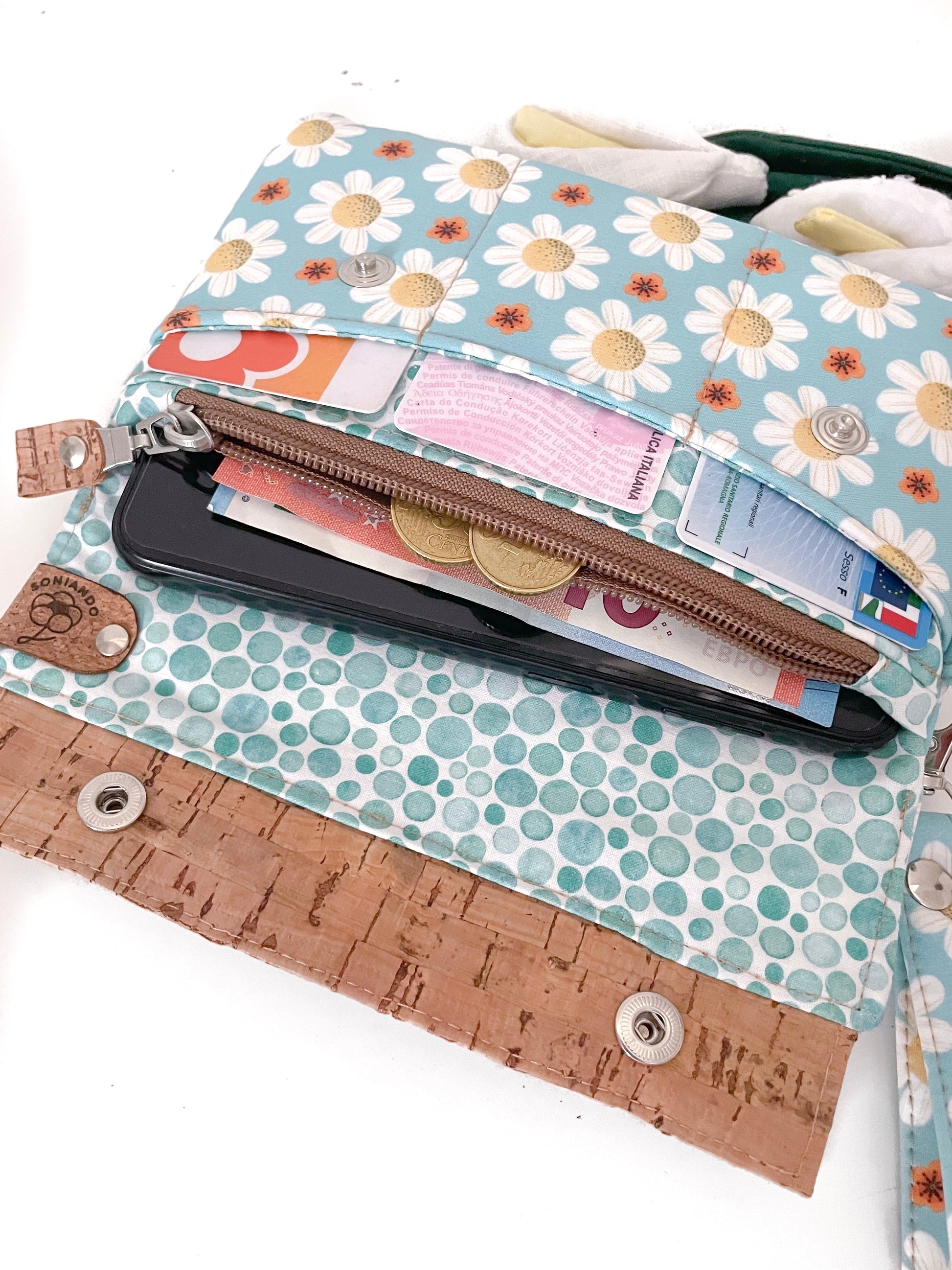 Composto da tre tasche per cards (ogni tasca ne può contenere più di una), una tasca grande con zip per banconote e monete e uno spazio per il cellulare.