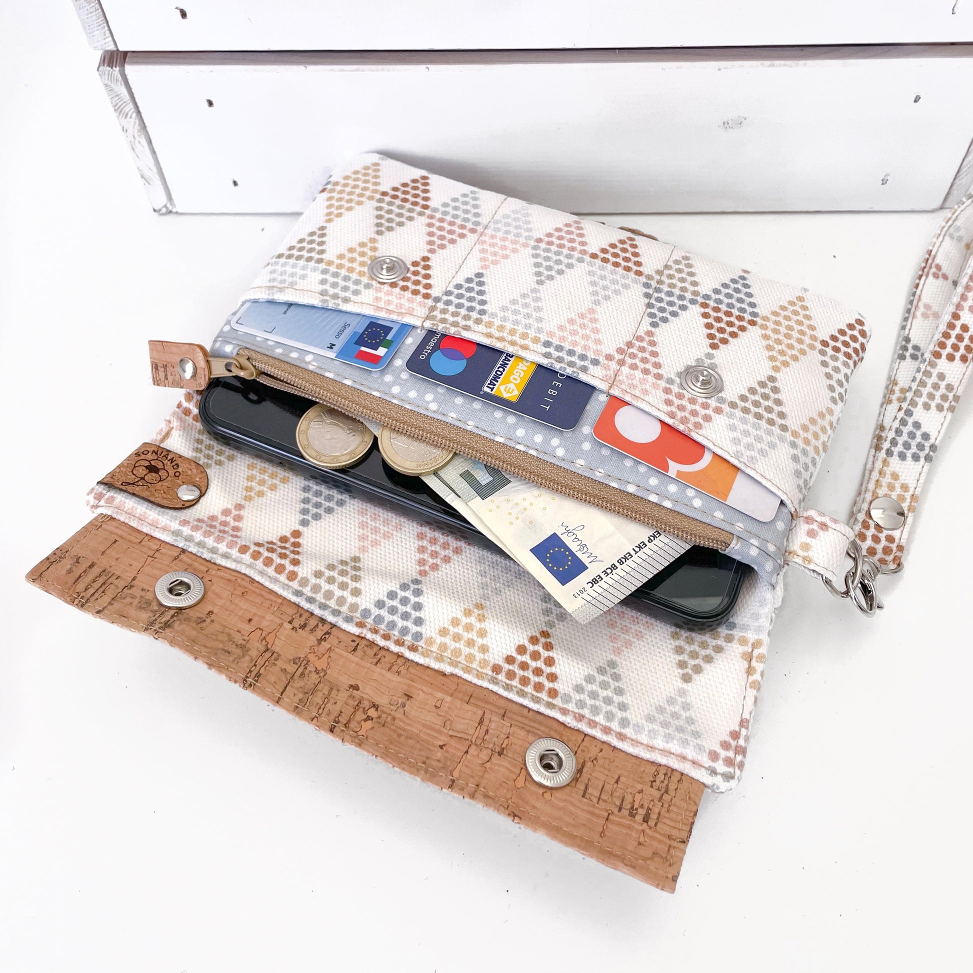 Composto da tre tasche per cards (ogni tasca ne può contenere più di una), una tasca grande con zip per banconote e monete e uno spazio per il cellulare.