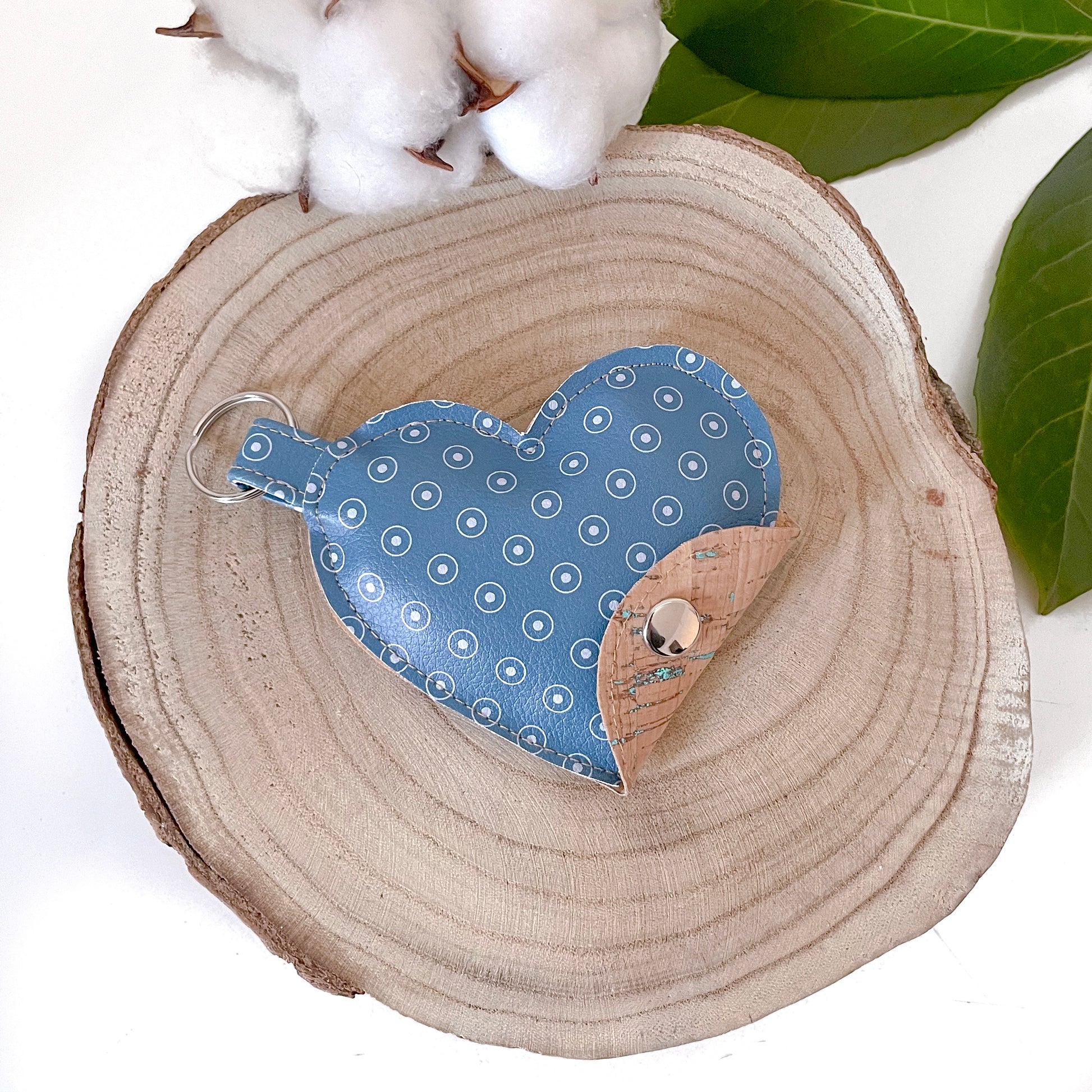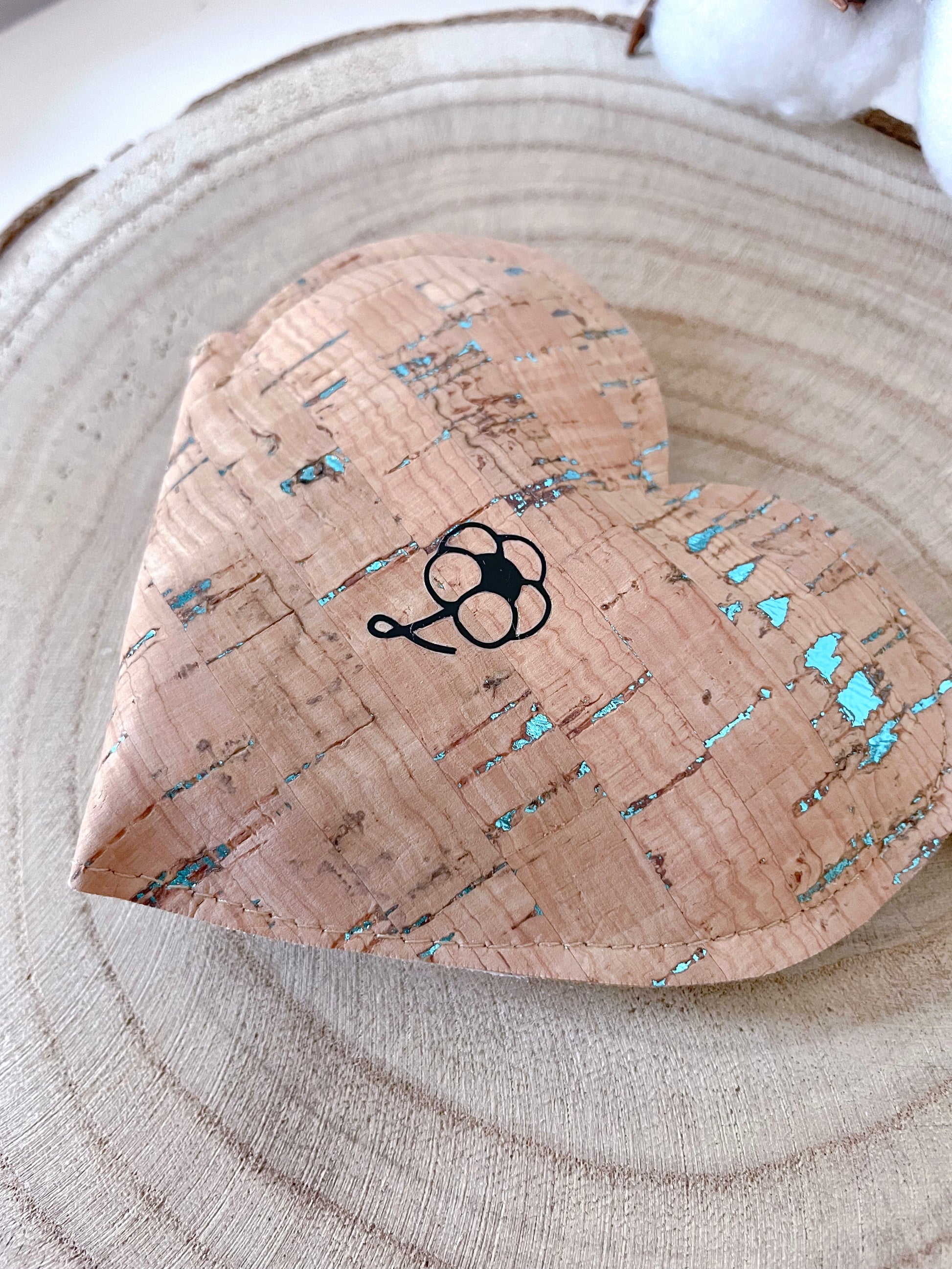 Portamonete e portachiavi a forma di cuore realizzato in ecopelle e sughero.