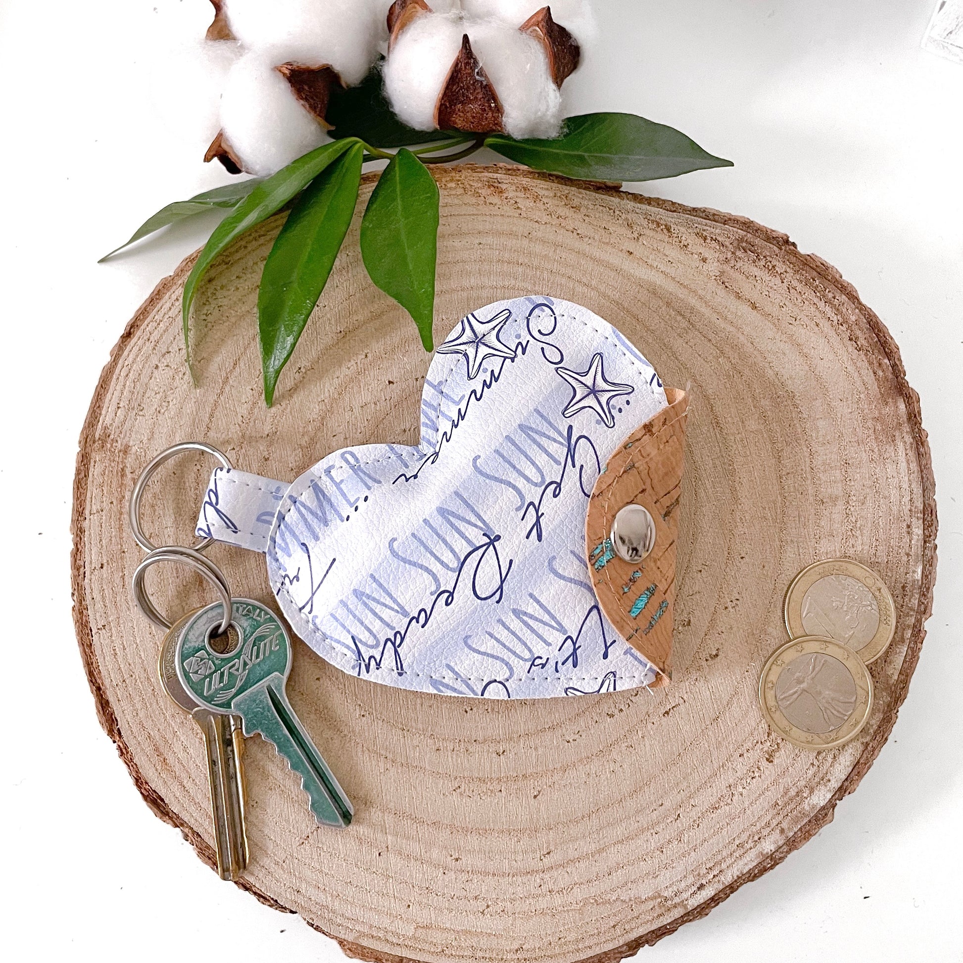 Portamonete e portachiavi a forma di cuore realizzato in ecopelle e sughero.