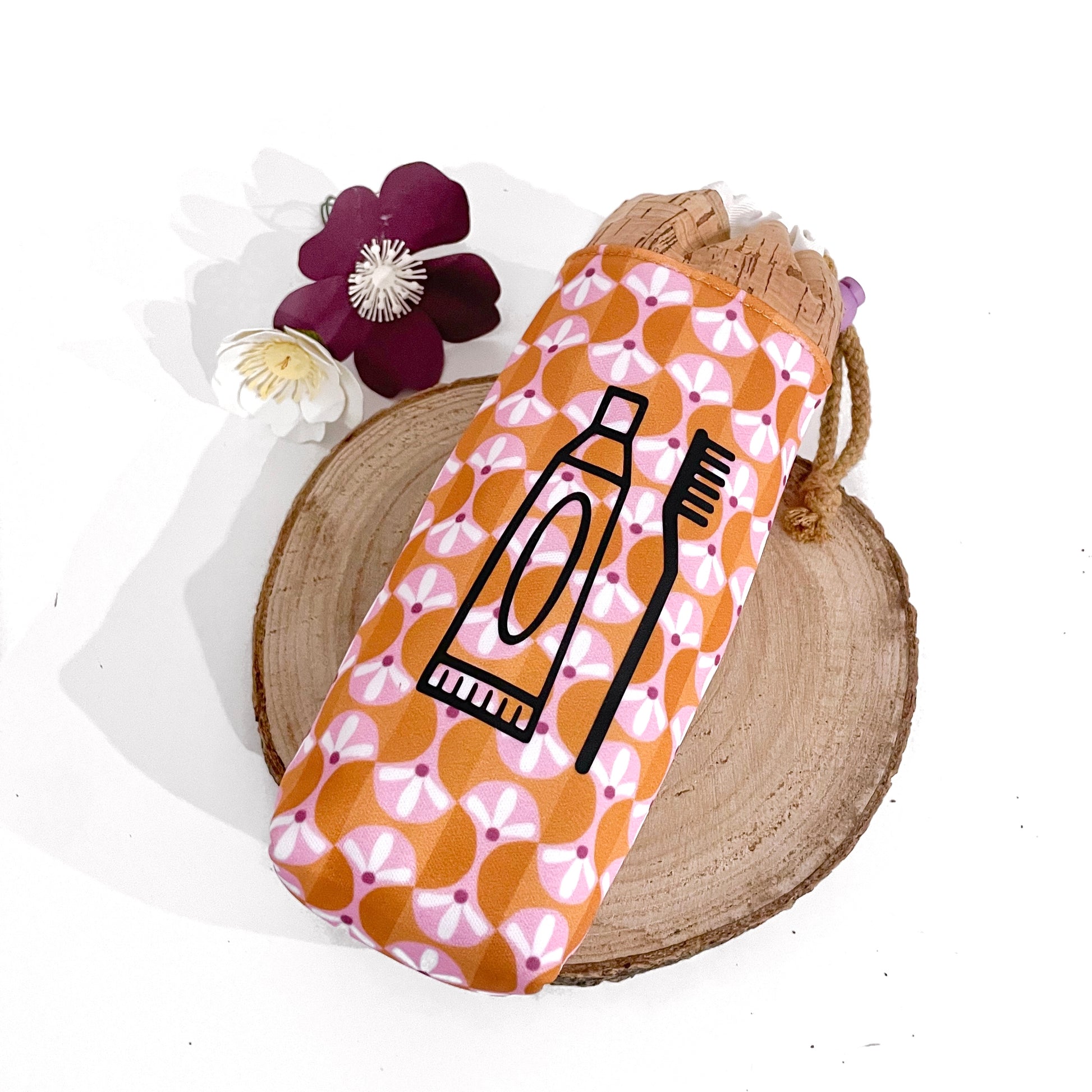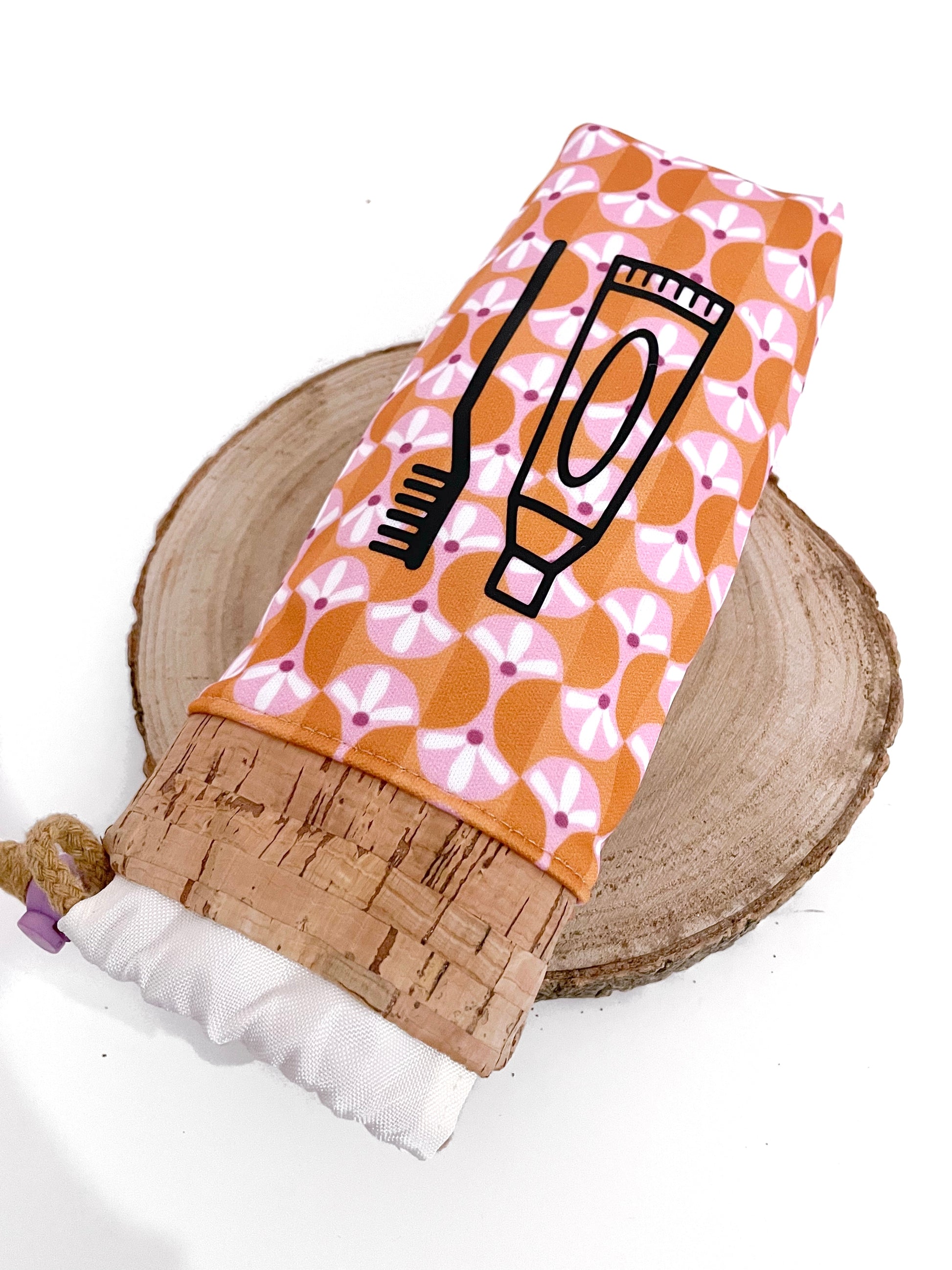 Portaspazzolino realizzato in tessuto idrorepellente e sughero. Tessuto idrorepellente anche per la fodera interna.