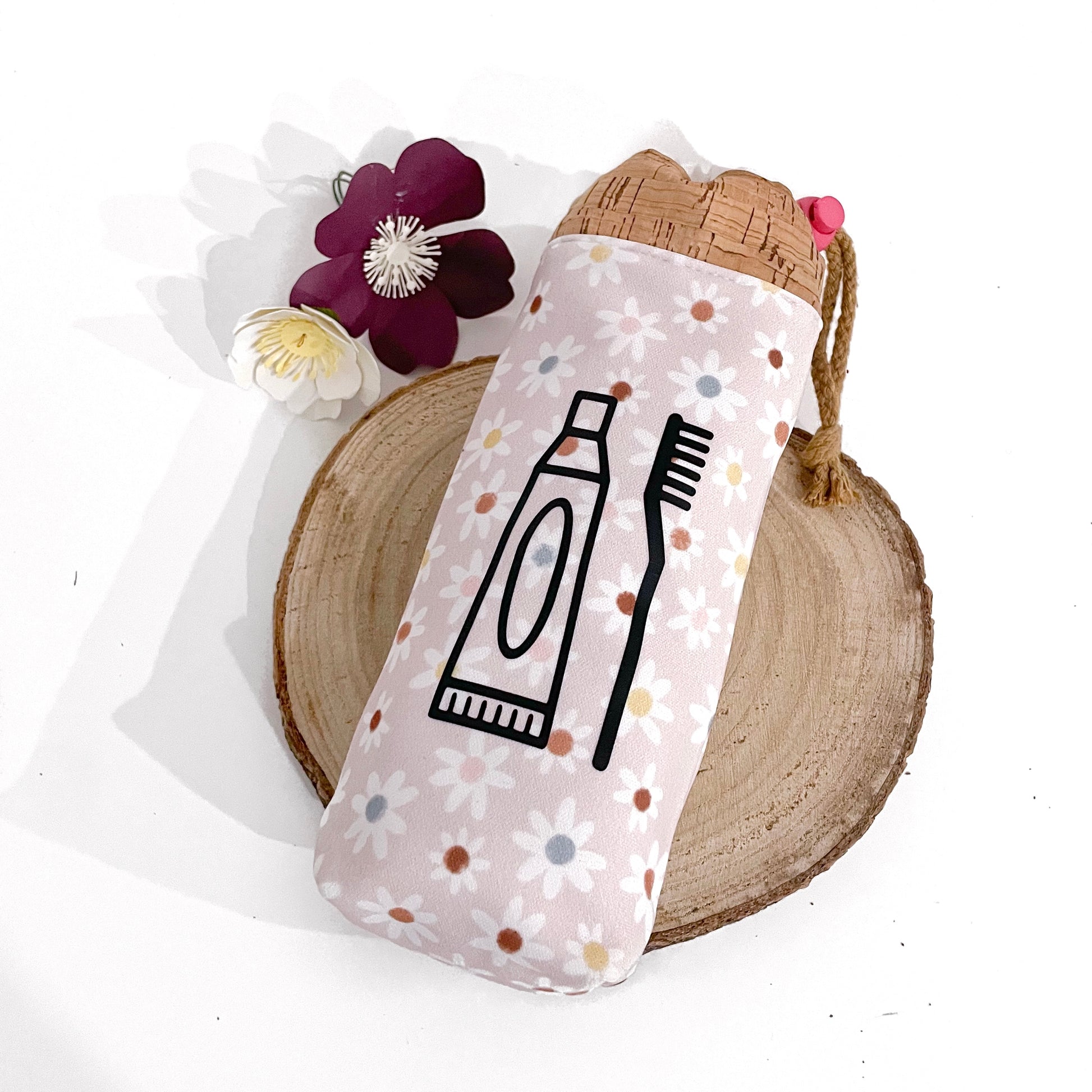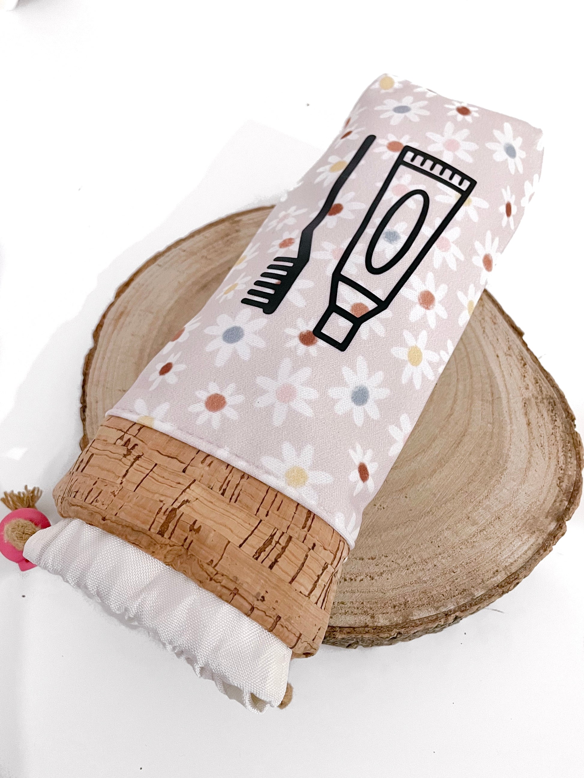 Portaspazzolino realizzato in tessuto idrorepellente e sughero. Tessuto idrorepellente anche per la fodera interna.