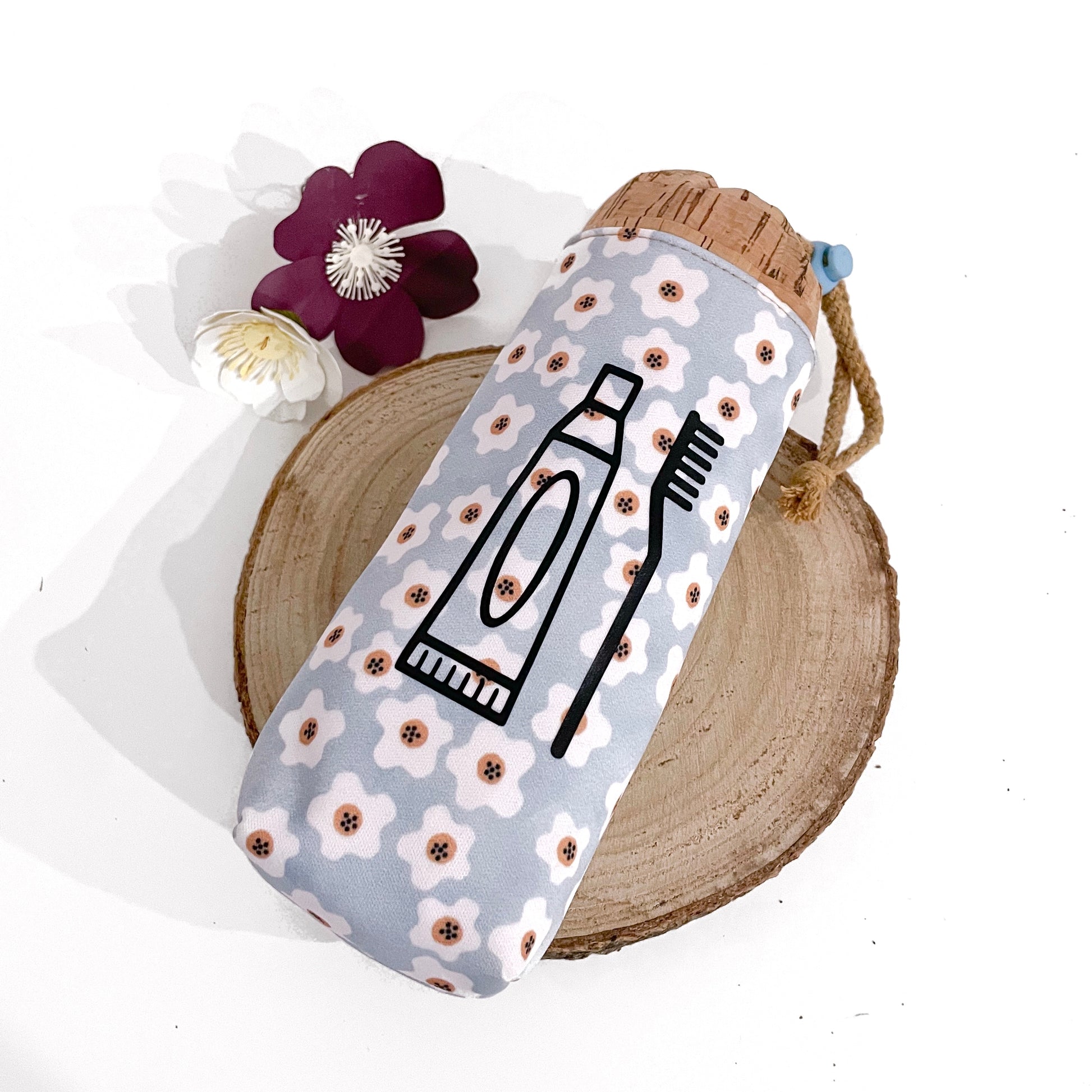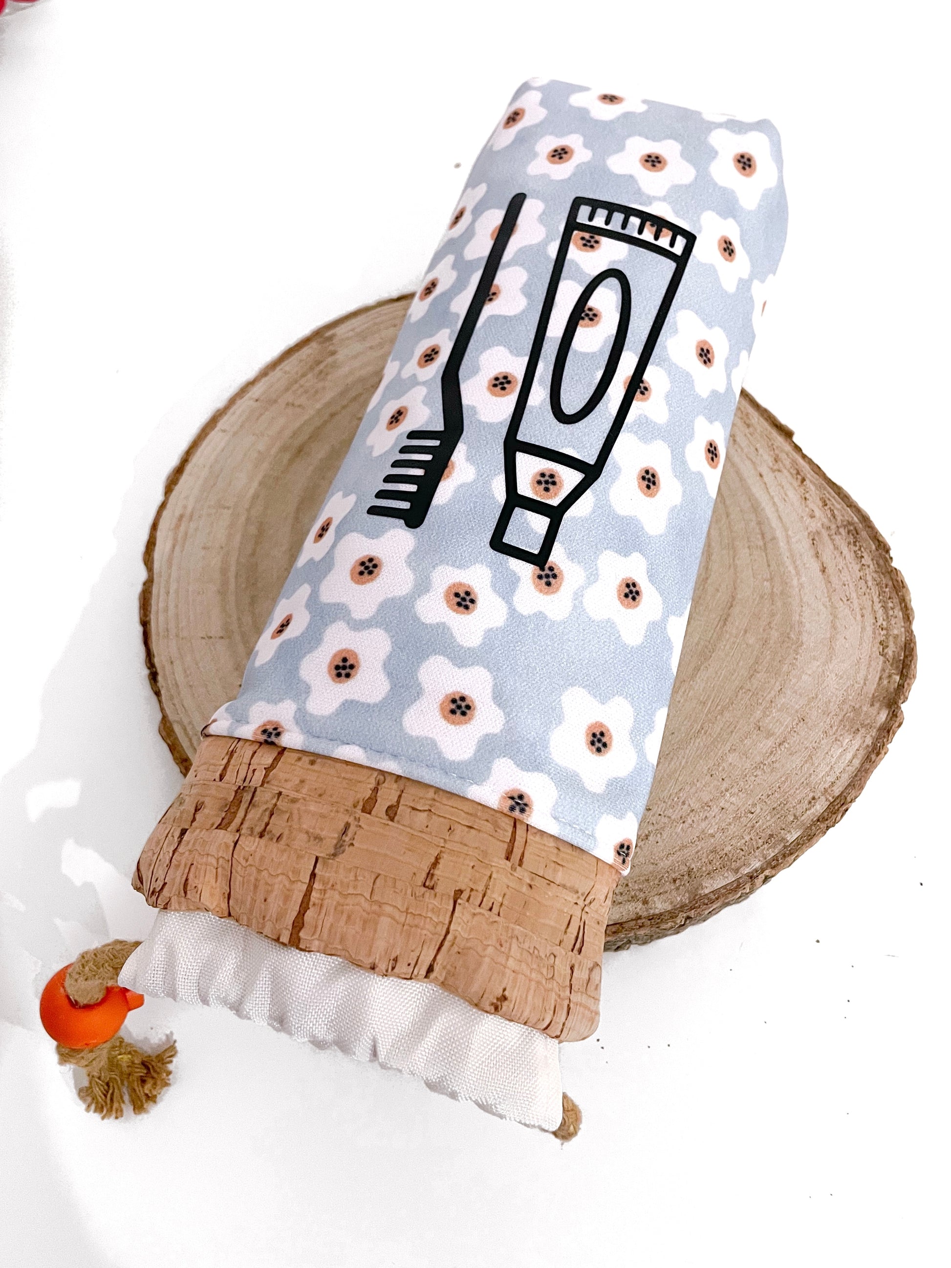Portaspazzolino realizzato in tessuto idrorepellente e sughero. Tessuto idrorepellente anche per la fodera interna.