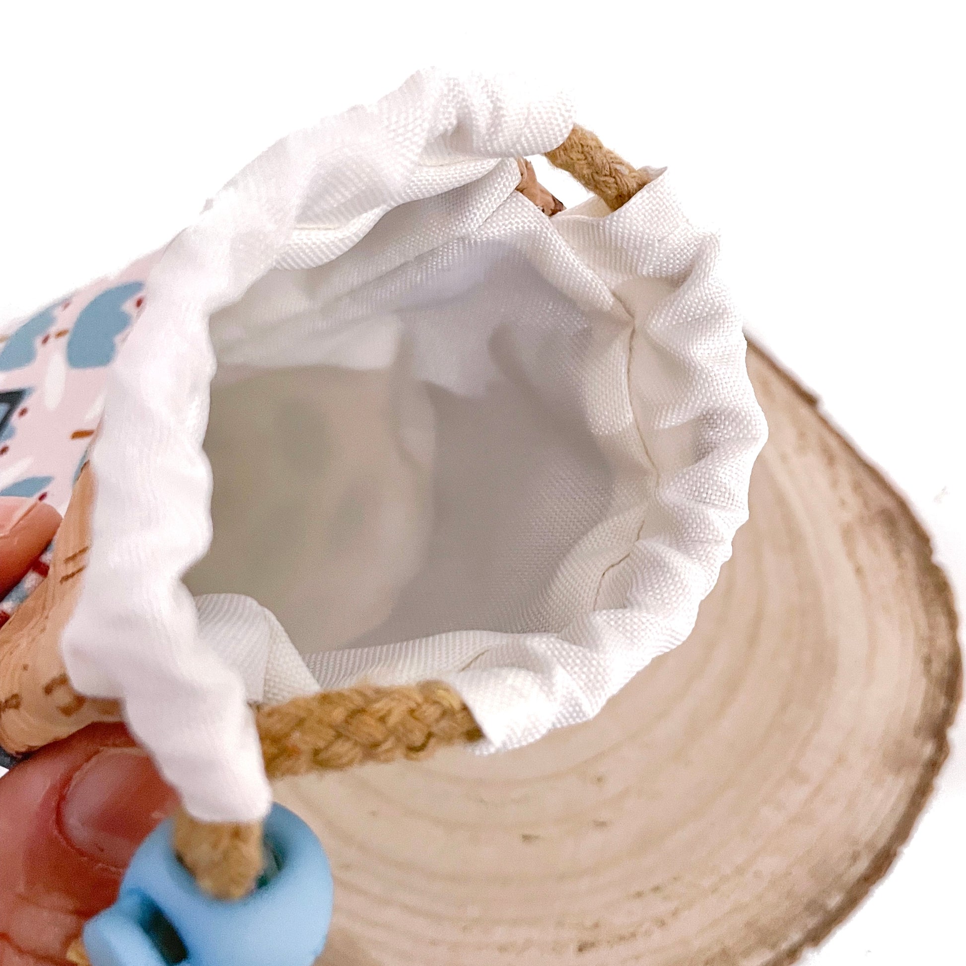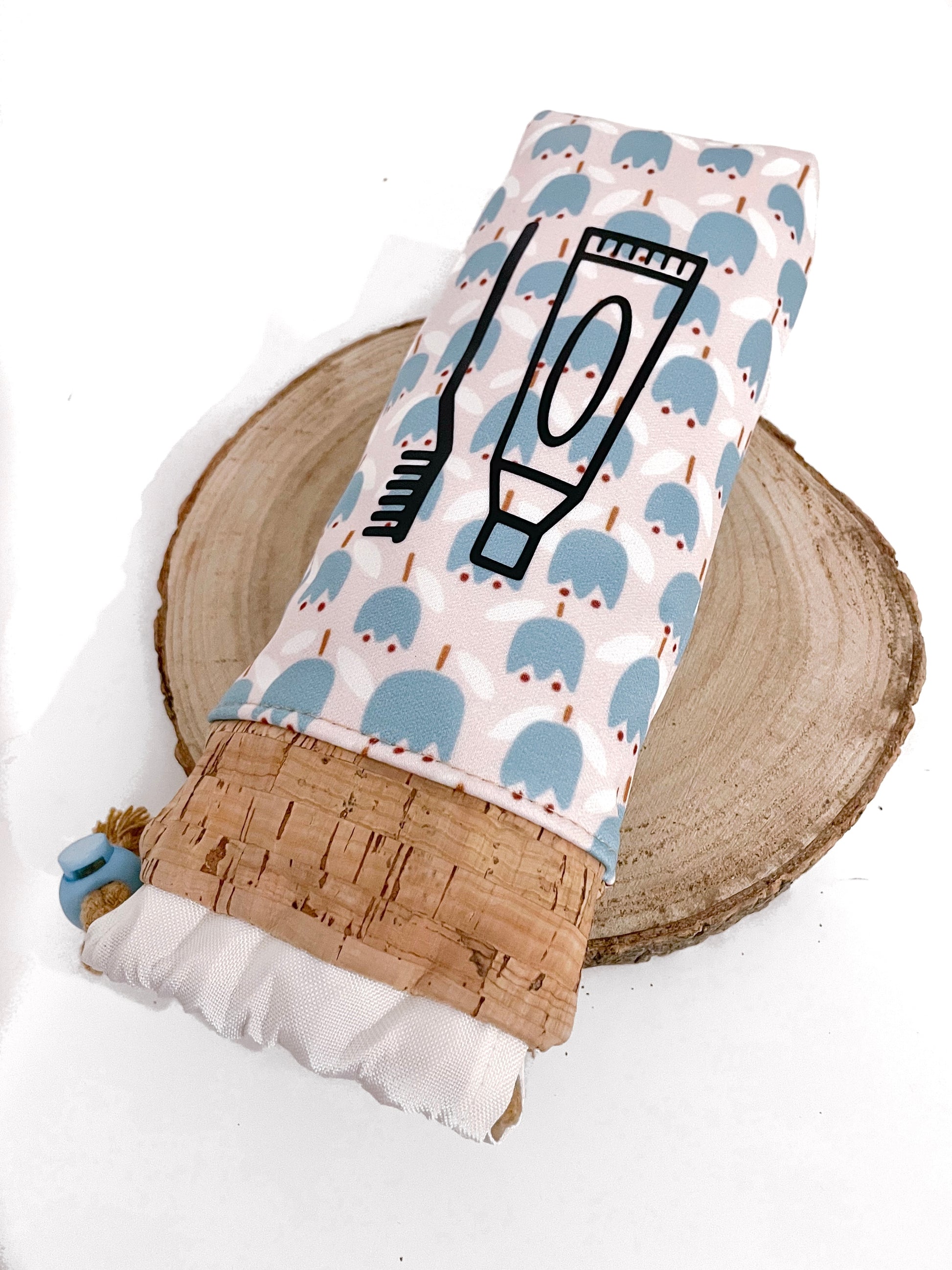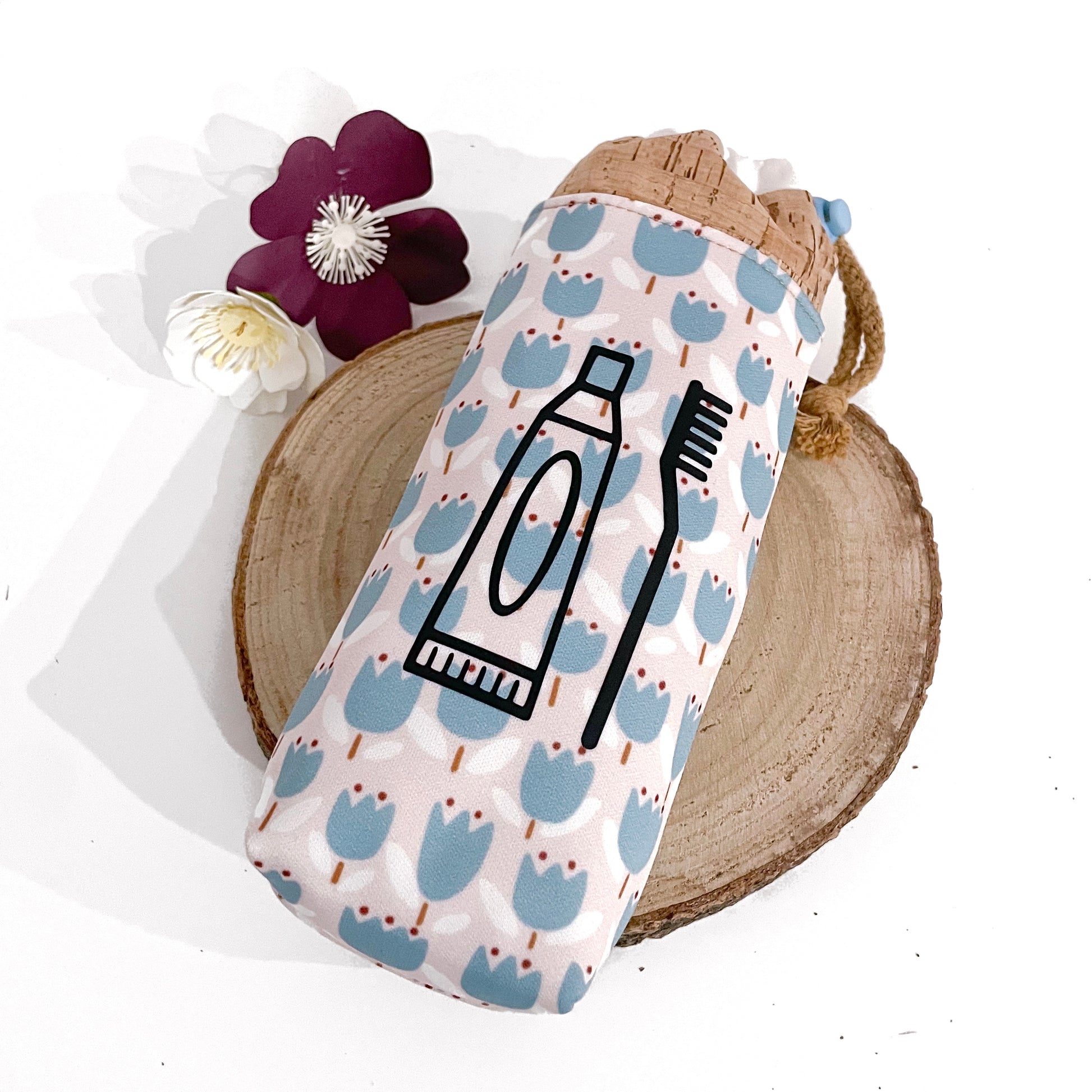 Portaspazzolino realizzato in tessuto idrorepellente e sughero. Tessuto idrorepellente anche per la fodera interna.