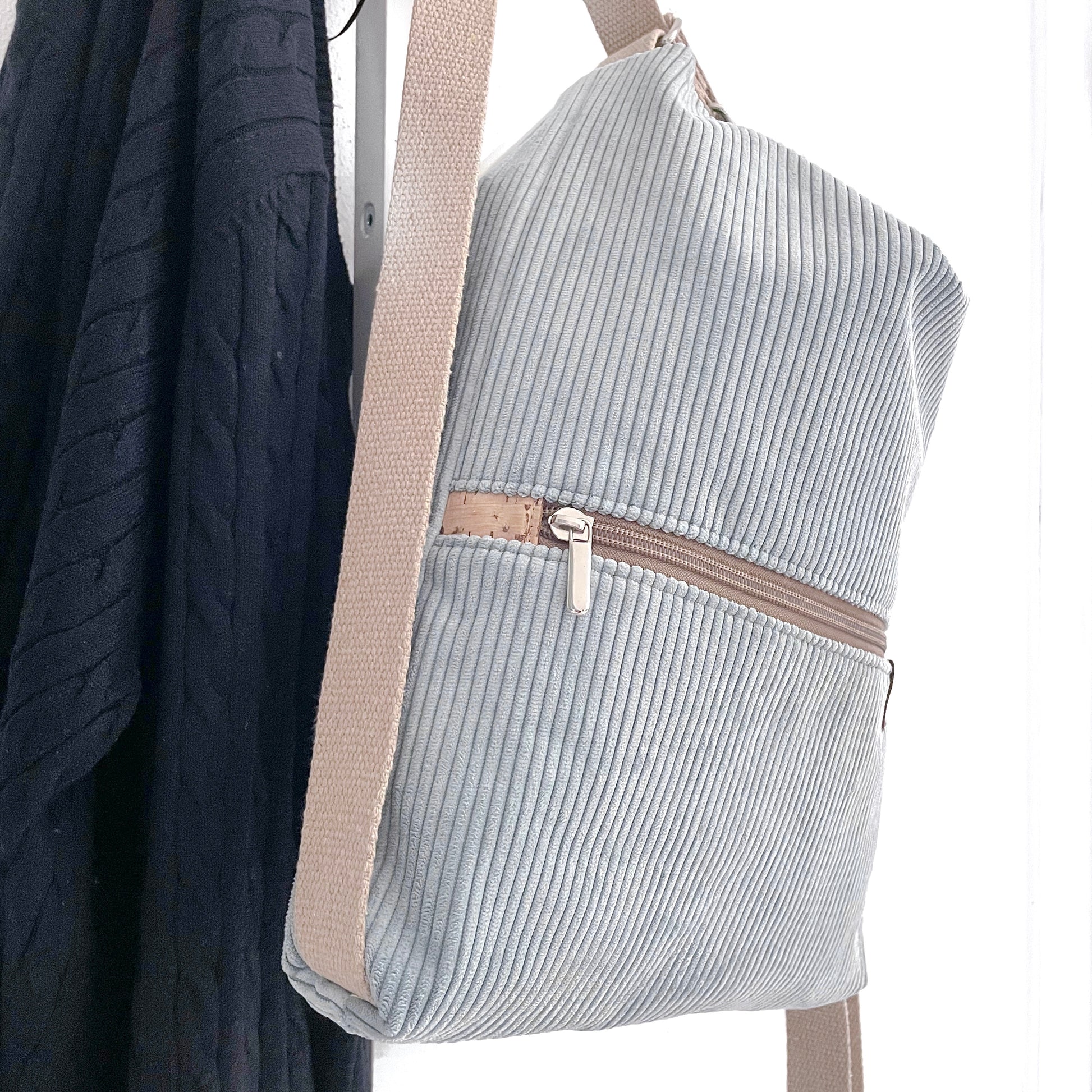 La sacca è realizzata in velluto con piccoli dettagli in sughero. Ha una capiente tasca con zip esterna ed foderata internamente in tessuto di cotone.
